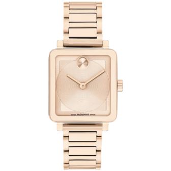 Movado BOLD Evolution 2.0 Tank Ladies. The evolution of modern design with a sharp look and elevated feel. 28x26mm Rose Gold PVD Square Case. Rose Gold PVD bracelet with push button deployment clasp. Rose microtextured Dial. K1 Crystal. Water resistant to 3 ATM. Swiss Quartz Movement.