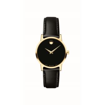 Movado Ladies Museum Classic Watch, 28 Mm Yellow Gold Pvd Case, Black Museum Dial With Tone-On-Tone Outer Ring And Silver-Toned Dot And Hands, Black Calfskin Strap With Yellow Gold Pvd Classic Tongue Buckle, Sapphire Crystal, Swiss Quartz Movement, Water Resistant To 30 Meters.