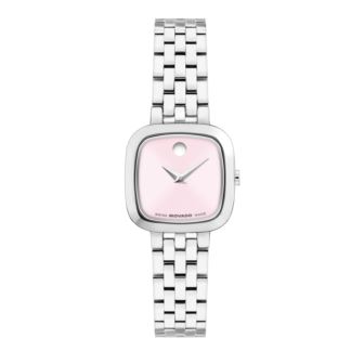 Movado Museum Bangle Ladies watch, "The iconic Museum Dial-first designed in 1947 and seen in art institutions around the world-reimagined in an elegant mini cushion shape.Crafted with a Swiss made movement. Designed with a 22mm stainless steel cushion case. Blush sunray dial. "