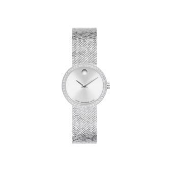 Movado Museum Velura Ladies watch, "In Esperanto, Velura means “silken", soft to the touch. The Museum Velura features a Milanese mesh bracelet that brings a supple, fabric-like quality to the metal.Crafted with a Swiss made movement. Designed with a 25mm stainless steel case. Lab grown diamond bezel. Silver-white sunray dial with signature dot at 12 o'clock."