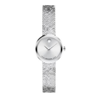 Movado Museum Velura Ladies watch, "In Esperanto, Velura means “silken", soft to the touch. The Museum Velura features a Milanese mesh bracelet that brings a supple, fabric-like quality to the metal.Crafted with a Swiss made movement. Designed with a 21mm stainless steel case. Silver-white sunray dial with signature dot at 12 o'clock. "