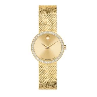 Movado Museum Velura Ladies watch, "In Esperanto, Velura means “silken", soft to the touch. The Museum Velura features a Milanese mesh bracelet that brings a supple, fabric-like quality to the metal.Crafted with a Swiss made movement. Designed with a 25mm yellow gold PVD case. Lab grown diamond bezel. Tonal sunray dial with signature dot at 12 o'clock."