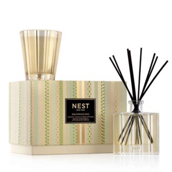 Create the aroma of a majestic winter forest with this bestselling fragrance, Birchwood Pine. Featuring the iconic scents blend of white pine, fir balsam, and birchwood over a base of rich musk and amber. Make your home feel festive with this exquisitely fragranced set. The Classic Candle is meticulously crafted with a proprietary premium wax formulated to burn cleanly and evenly, while the Reed Diffuser is made with the highest quality oils to release continuous fragrance for 90 days, uninterrupted. Each is housed in a glass vessel with a festive, metallic gold design. Cruelty-Free & Vegan. Reusable Glass Holder. Free from Formaldehyde, Parabens, Phthalates. Classic Candle 8.1 oz H 4.125" x W 3.5". Reed Diffuser 5.9 fl oz H 4.72" x L 3.75" x W 2.6". Made in USA.