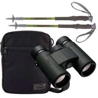 Pack light with this three-in-one birding bundle: the Nikon PROSTAFF P3 10x30 compact binoculars bring faraway subjects into close focus, revealing even the smallest details. Waterproof, fog-proof and drop-resistant design stores easily in the Hex Ranger Crossbody bag with Water-resistant Cordura and Anti-Microbial Technology. Use the included pair of super-light and compact Kelty trekking poles to help traverse your path - featuring , adjustable length of 35-54 inches, adjustable padded wrist straps, and non-slip carbide tips plus tip covers.