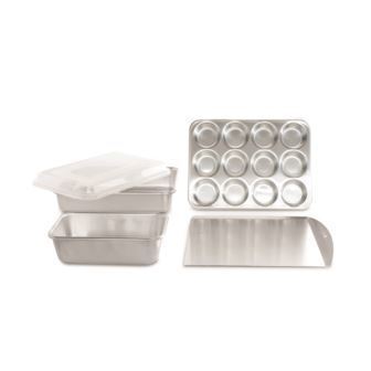 This 5-piece Baking Set includes a 1.5 pound loaf pan, a medium classic cookie sheet, a 12-cup muffin pan and a 13 x 9-inch cake pan with a lid that will also fit the muffin pan. Baking professionals know that the secret to evenly-baked and perfectly browned food is to cook with aluminum bakeware. Turns out perfect results every time, whether you're making bars, brownies, or cookies. When you want a set of bakeware that can handle a variety of recipes, add the Nordic Ware Naturals 5-Piece Baking Set to your bakeware collection.