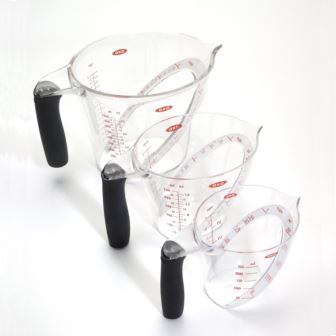 1, 2 & 4 Cup Angled Measuring Cups. Angled surface lets you read measurements from above. Eliminates the need to fill, check and adjust. Soft, non-slip handle. Standard and metric measurement markings. Dishwasher safe.