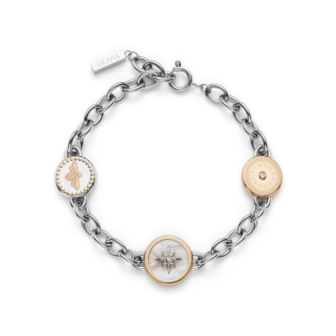 Prepare to be charmed by our vintage-inspired collection. This Stainless Steel & Rose gold-plated bracelet features a trio of beautifully detailed charms. Each charm represents a treasured motif for our brand, including a playful bee, a North Star set on faux mother of pearl and a crystal-set disc with ribbon etching. Paired with a heavy-link gold-plated chain