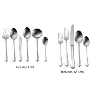 High Quality 18/10 Stainless Steel in hi-luster finish. Sculptured handle is good for both casual and formal tables. (12ea) Place Knives, Place Forks. Place Spoons, Salad Forks, Teaspoons. Butter Knife, Sugar Spoon, Serving Fork, Serving Spoon. Pierced Serving Spoon, Serving Ladle. Dishwasher Safe, Limited Lifetime Warranty.