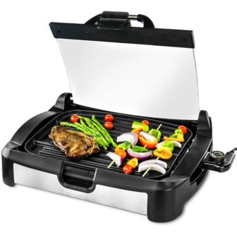 Versatile, Efficient, and Easy to Clean. Its versatility goes beyond your typical grilled fareyou have the option to cook anything that cooks in a griddle or skillet too. From blueberry pancakes to juicy, grilled steaks, this grill/griddle does it all! It comes equipped with 1700 Watts of power, which allows it to instantly heat up and cook food faster than conventional grills or griddles. All removable parts are dishwasher safe (except for the temperature controller). The drip tray and base are cleaned easily from hand washing in warm, soapy water. Heavy-Duty and Portable.Perfect for family vacations, picnics, and all types of occasions. It was designed for easy storage, making it great for both indoor and outdoor use. Healthy Grilling and Cooking at the Right Temperature. Comes with a grill holes that drain excess fats and a drip tray to catch it all for a more healthy and delicious meal! The adjustable and removable temperature controller is very user-friendly, and once attached, it heats up the grill instantly. It also comes with a heat-tempered glass lid, which keeps your food hot, moist, and crispy while preventing any messes.