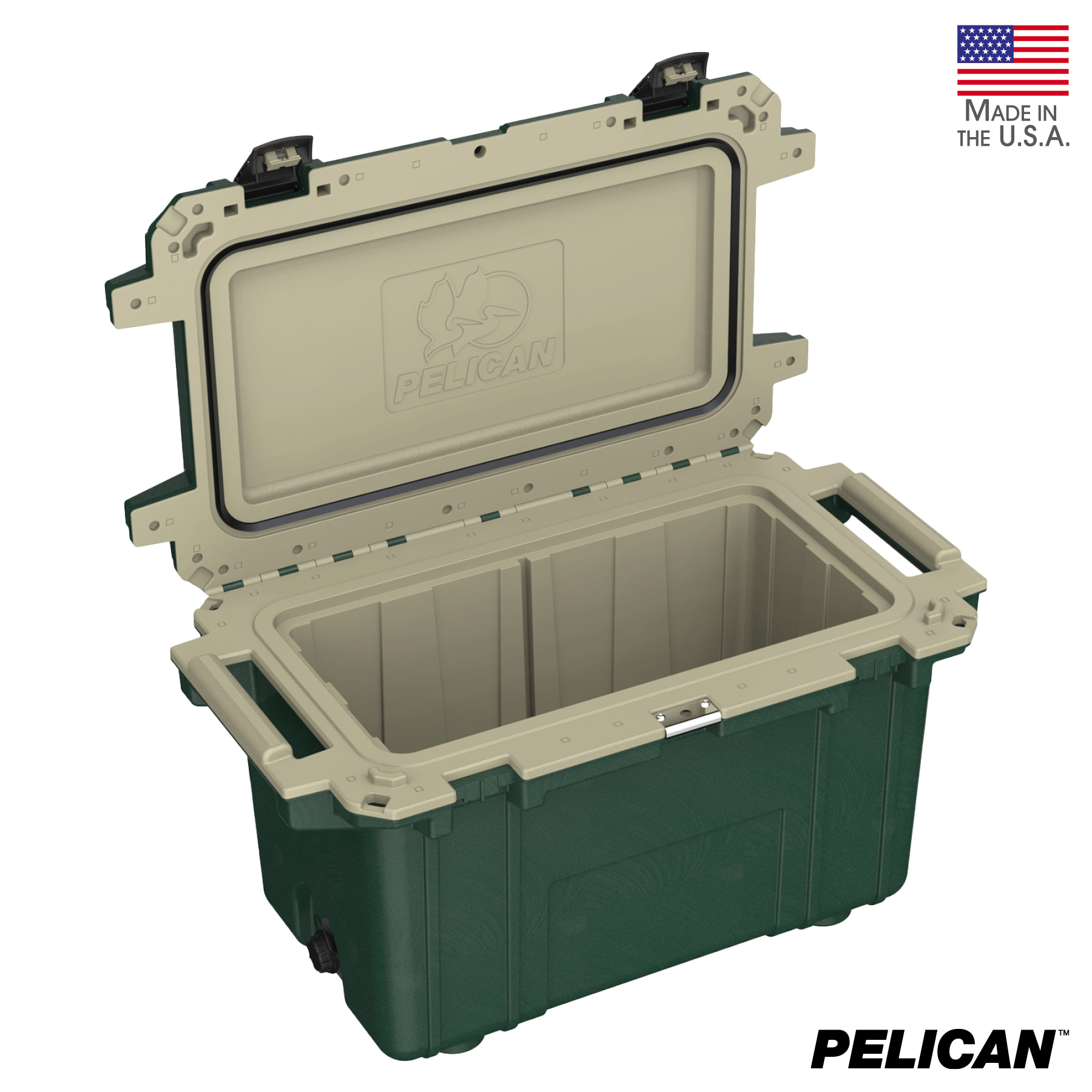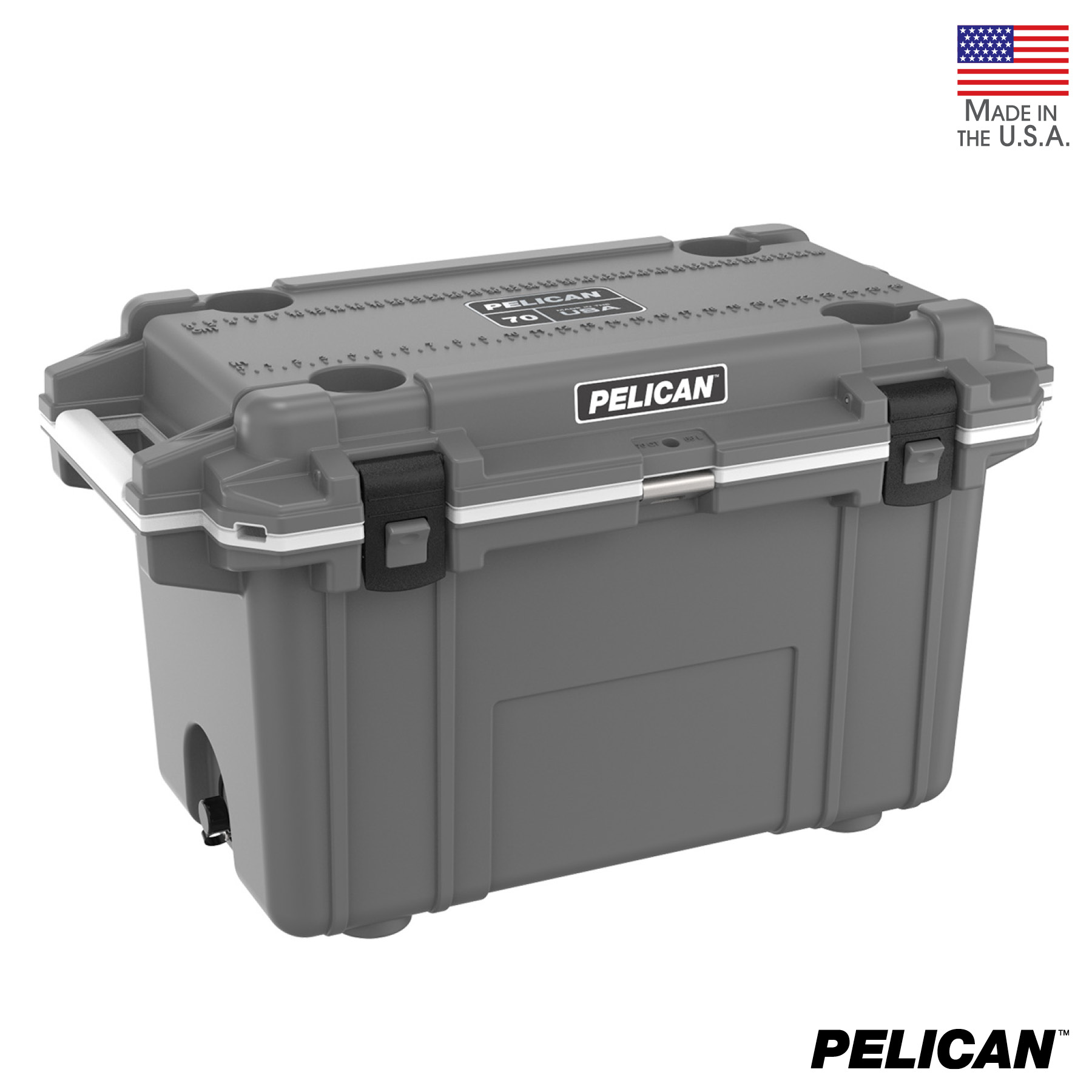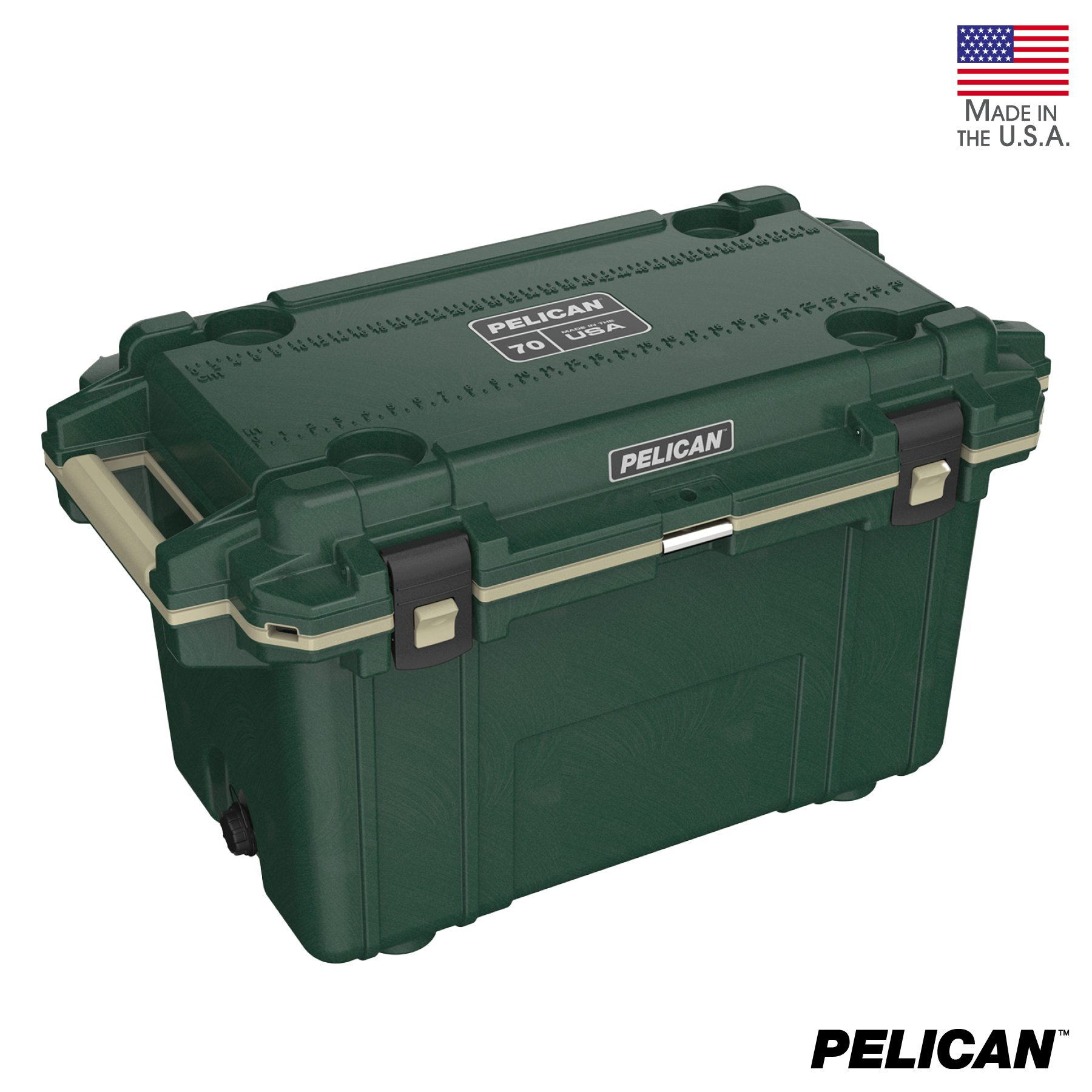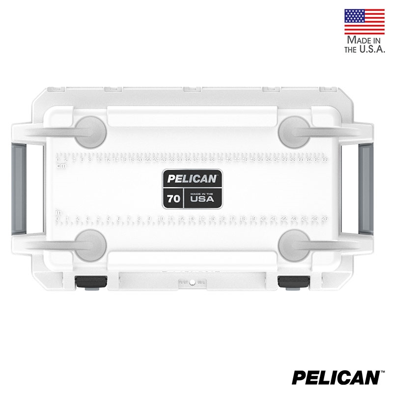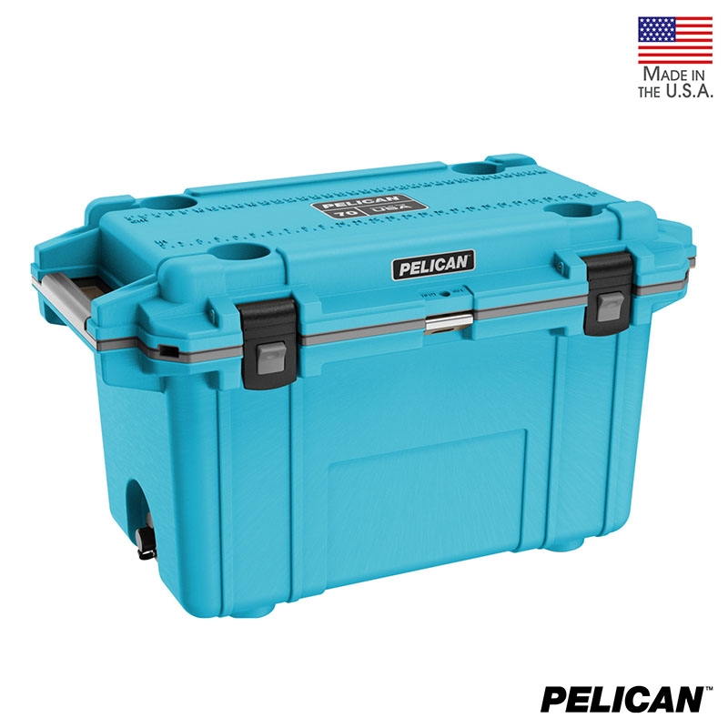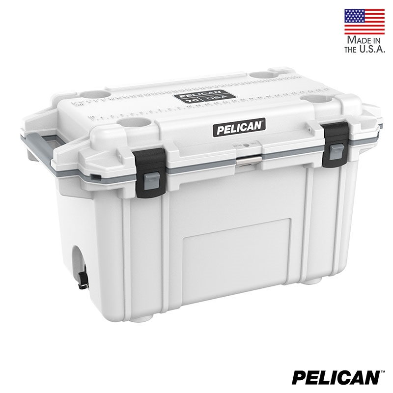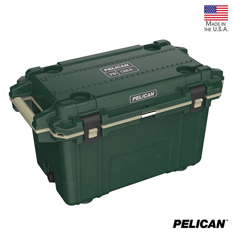 70 quart Pelican™ Elite coolers perform to the highest of standards - better and tougher than any other cold locker or icebox. Pelican Products has protected defense, emergency and scientific expedition equipment through some of the harshest conditions on Earth since 1976. Extreme insulation keeps ice for up to nine days. The molded-in lock hasp keeps your contents secure and has an integrated bottle opener. It also features and integrated fish scale on the lid, molded-in carry handles and four can holders. The cooler has a sloped floor and a tethered drain plug that is threaded for a standard garden hose. It is made in the USA and offers a lifetime guarantee.