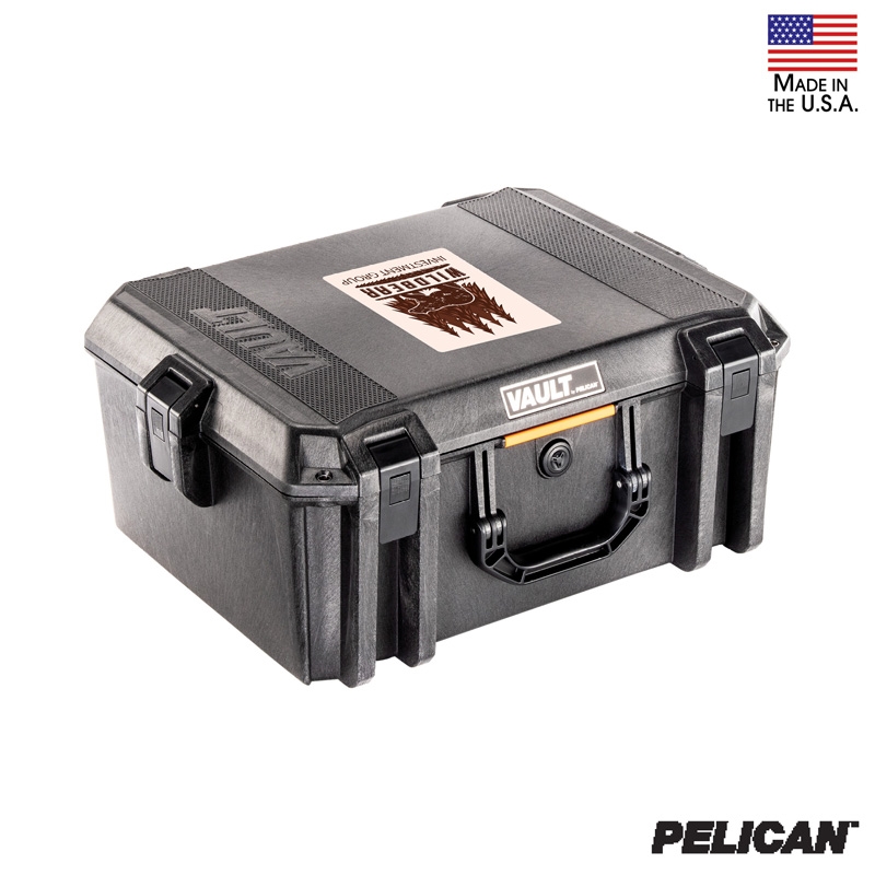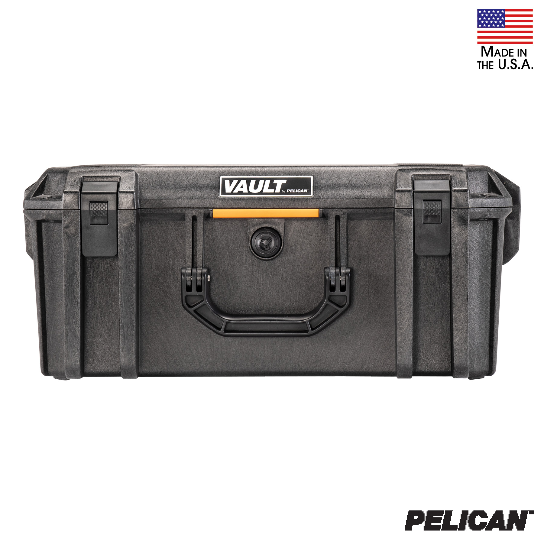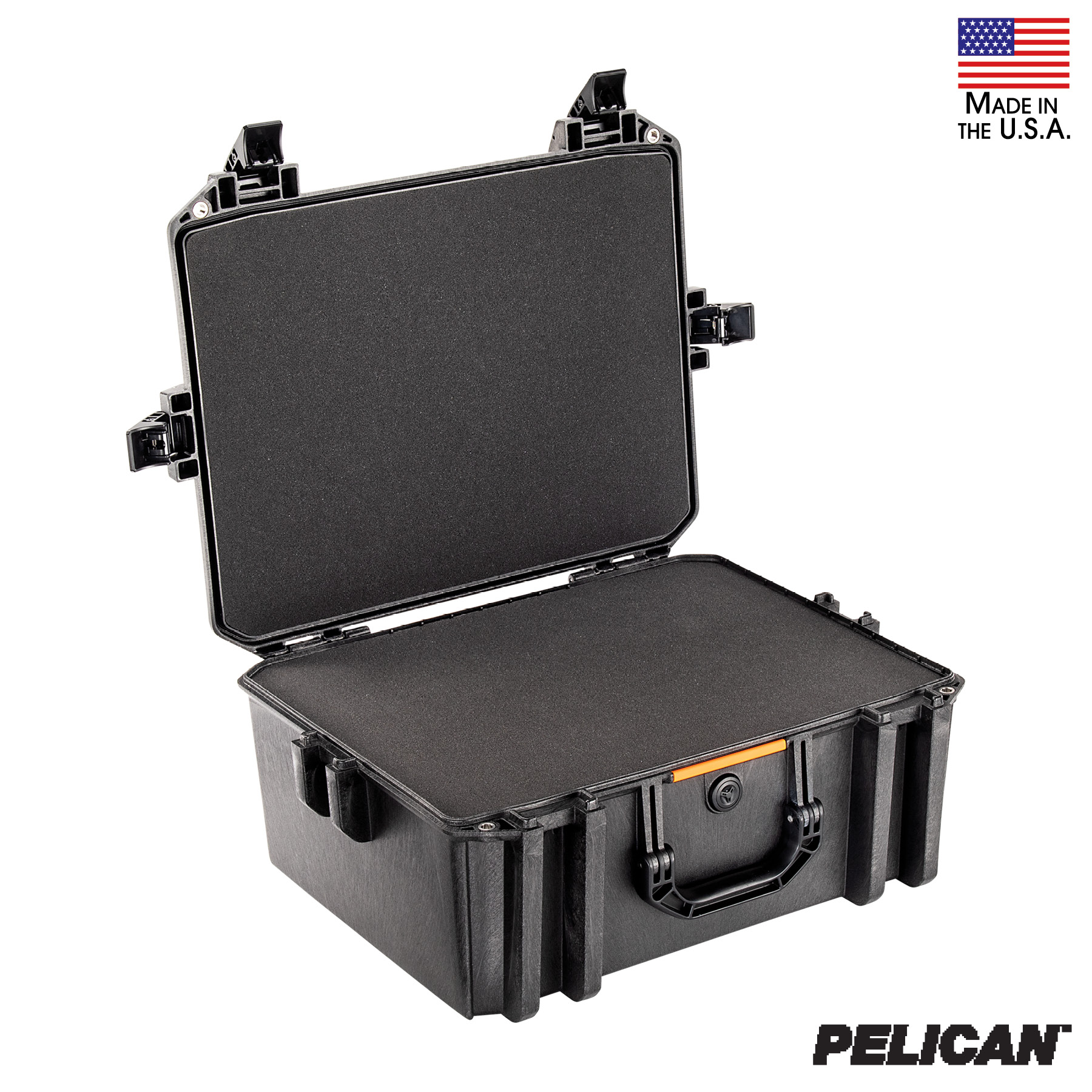 The Pelican™ V550 Vault Equipment Case is crushproof, dustproof and weather resistant. It has heavy duty ergonomic handles that can withstand rugged conditions and five layers of protective foam which can be cut by the recipient to hold their desired object. This case has high-impact polymer which will protect your equipment via road, trail or air travel and through all types of weather conditions, and two push-button latches that allow secure closure and easy-open access. Its two stainless steel lock hasps offer extra security during transport. The interior dimensions are 19” x 14" x 8 ½” and it has a 1 year limited warranty. Made in the USA.