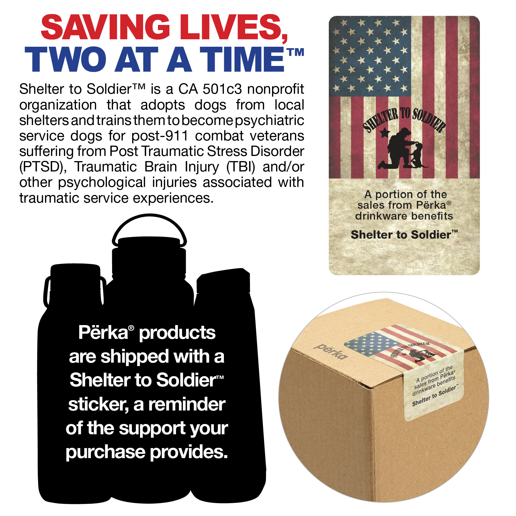 The Perka® Erie 16 oz. double wall stainless steel tumbler is vacuum sealed and has a flip-up spout cover. The unique bell-shaped tumbler is perfect for the office with its clean, executive look and will keep your iced coffee cold for 6 hours and your hot coffee hot for 6 hours. This tumbler is FDA Compliant & BPA Free. A portion of all proceeds is donated to Shelter to Soldier™, a non-profit organization that rescues dogs to train as service animals for veterans in need.