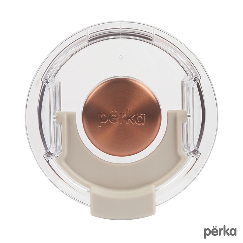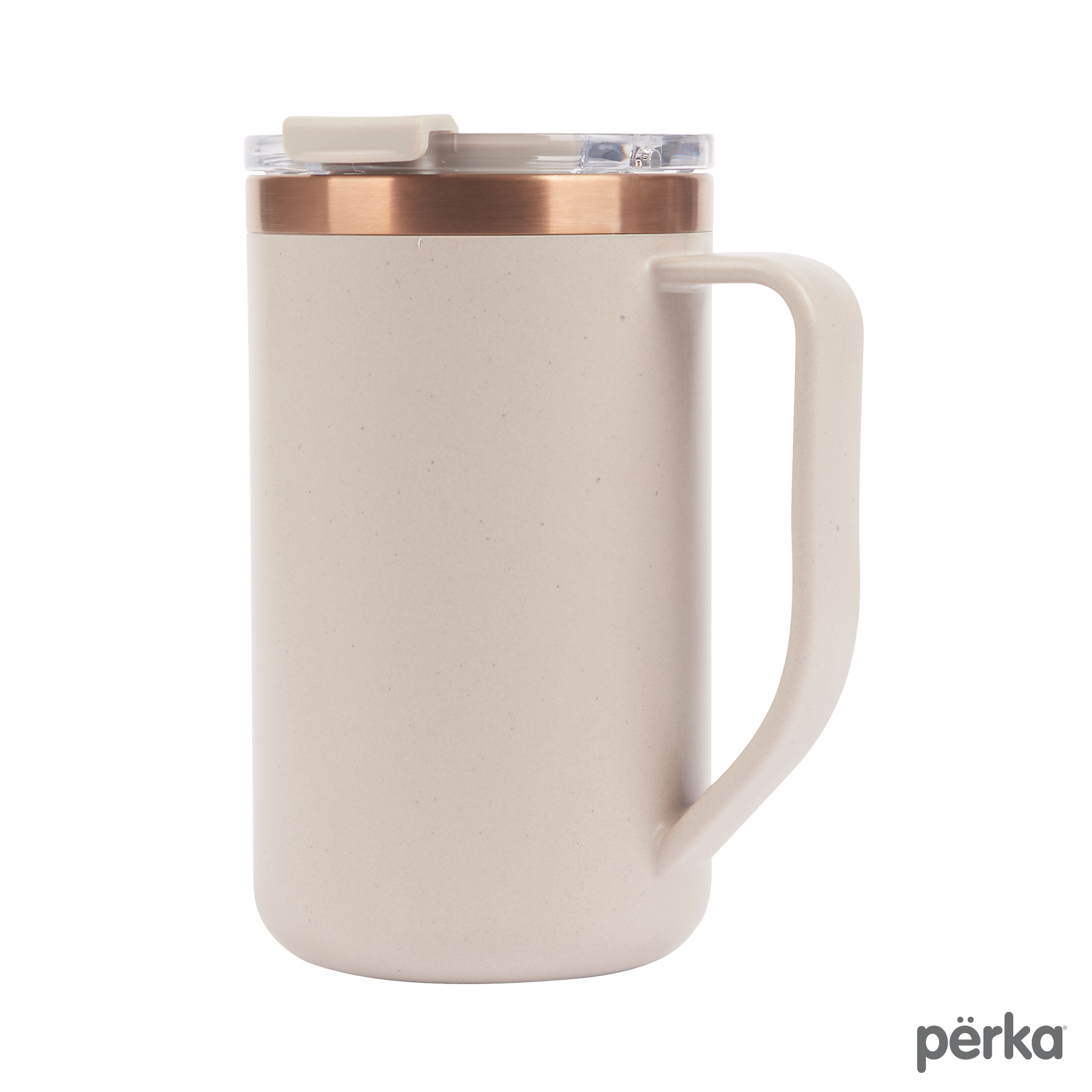 Choose the Perka® 15 oz. Guji Coffee Mug to experience the perfect blend of style, sustainability, and practicality. With a nod to love for coffee, the outer wall and handle of the mug are crafted from a unique blend of recycled coffee grounds and recycled polypropylene, and the inner wall is made of post-consumer recycled 18/8 stainless steel making this mug an eco-conscious choice. This coffee mug comes with a transparent push-on lid allowing you to keep an eye on your beverage levels and the flip closure reduces the risk of spills while you are on the move. A touch of elegance is added to the design with a copper trim enhancing the visual appeal of the mug. Choose the Perka® Guji coffee mug for sipping your favorite beverages with the warmth of sustainability in your hands. BPA Free and FDA Compliant. A portion of all proceeds is donated to Shelter to Soldier™, a non-profit organization that rescues dogs to train as service animals for veterans in need.