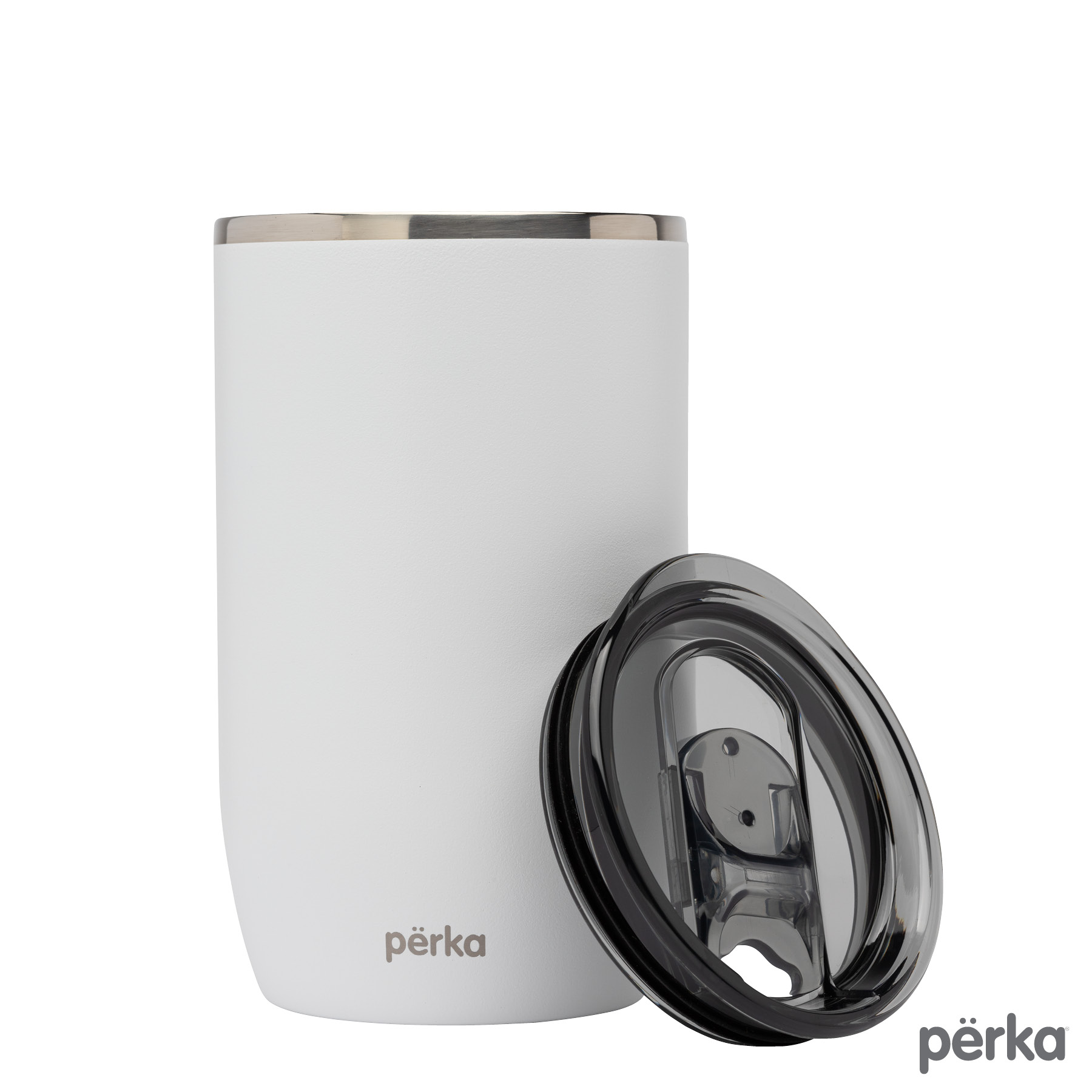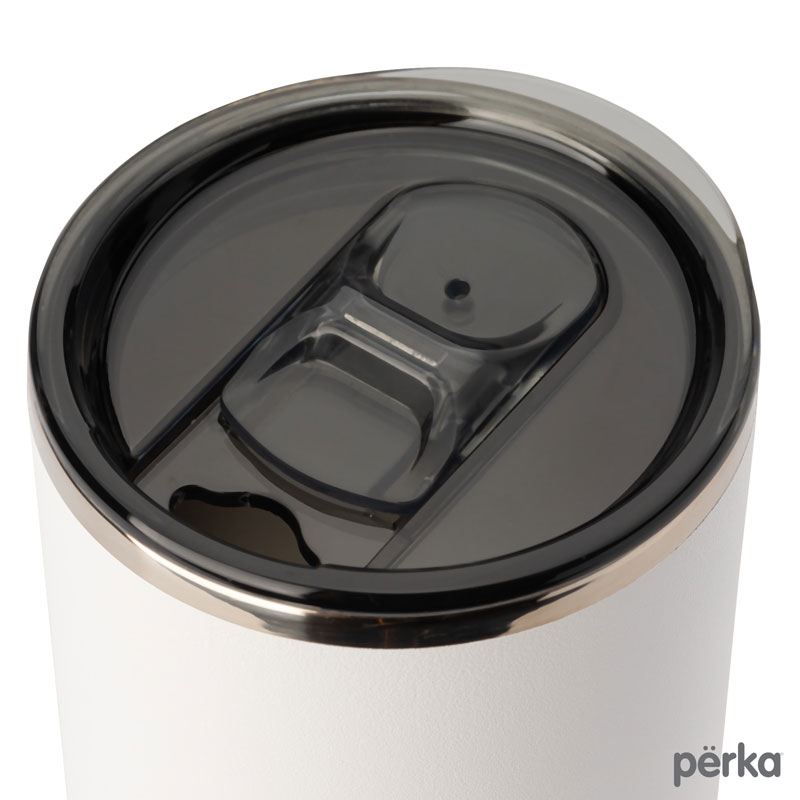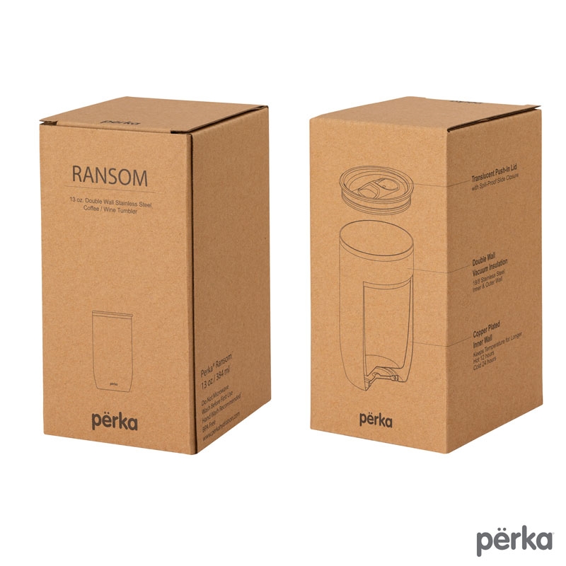 Perka® Ransom Tumbler has a modern and sleek design with an elegantly slim polished top ring and smoky translucent lid. Perfect for home, office or your morning commute, this tumbler holds 13 oz. of your favorite beverage and both the inner and outer walls are made from 18/8 grade stainless steel. Its double wall vacuum insulated construction and the copper lining keep your hot drink hot for 12 hours and cold drink cold for 24 hours. It also features a translucent push-in lid with a spill-proof slider closure to keep your drink safe and clean and its exterior powder coat finish is durable and sweat proof. The Ransom fits in most car cup holders and standard coffee machines and is BPA Free and FDA Compliant. A portion of all proceeds is donated to Shelter to Soldier™, a non-profit organization that rescues dogs to train as service animals for veterans in need.