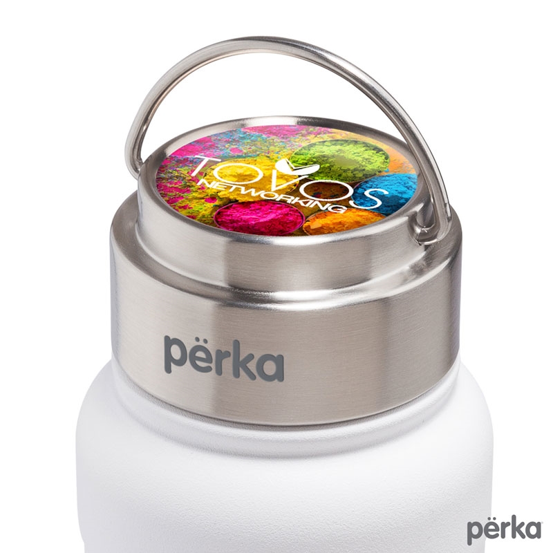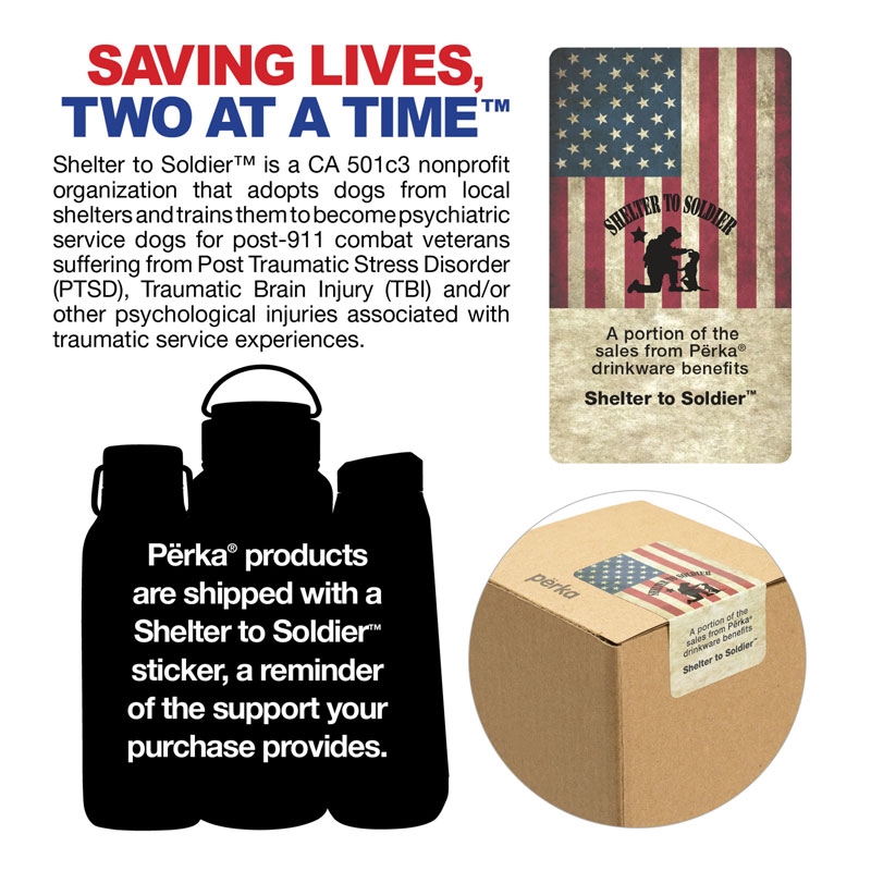 The Perka® Roak 304 stainless steel bottle has a double wall construction with vacuum seal and copper lining for added insulation. This bottle features a ridged grip for easy handling and a stainless steel twist off cap with silicone ring. The exterior is powder coated to reduce sweating and the cap has a hinged steel carry handle for easy pick up. Liquids stay hot for 12 hours and cold for 24. FDA Compliant and BPA Free. A portion of all proceeds is donated to Shelter to Soldier™, a non-profit organization that rescues dogs to train as service animals for veterans in need.