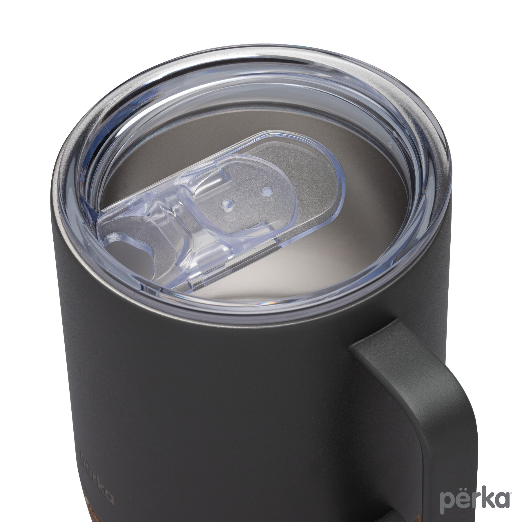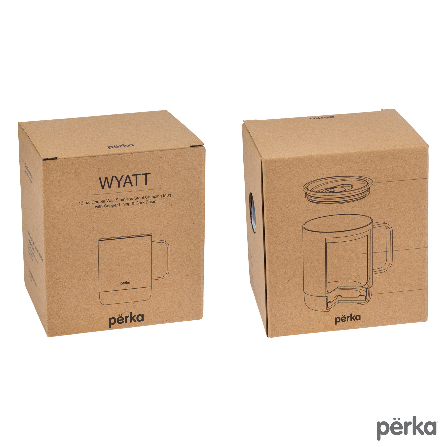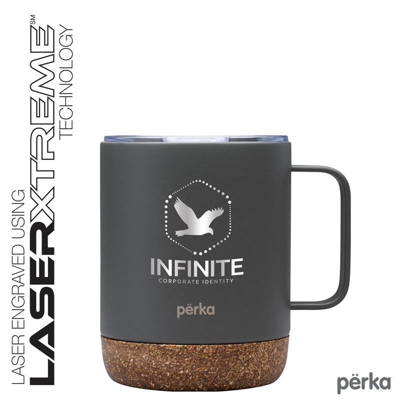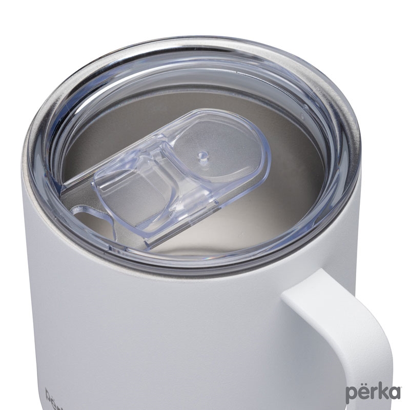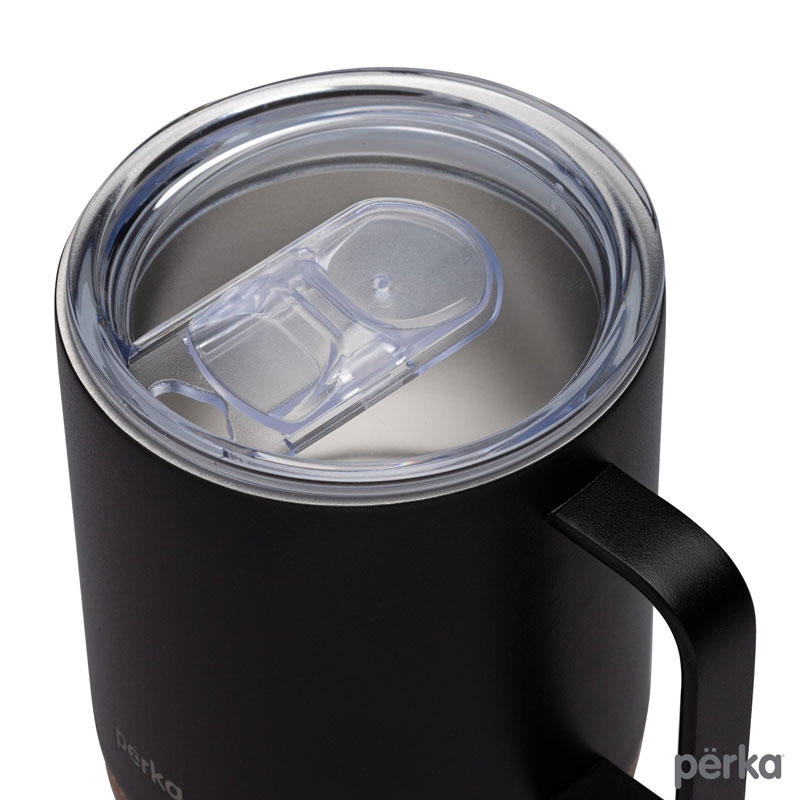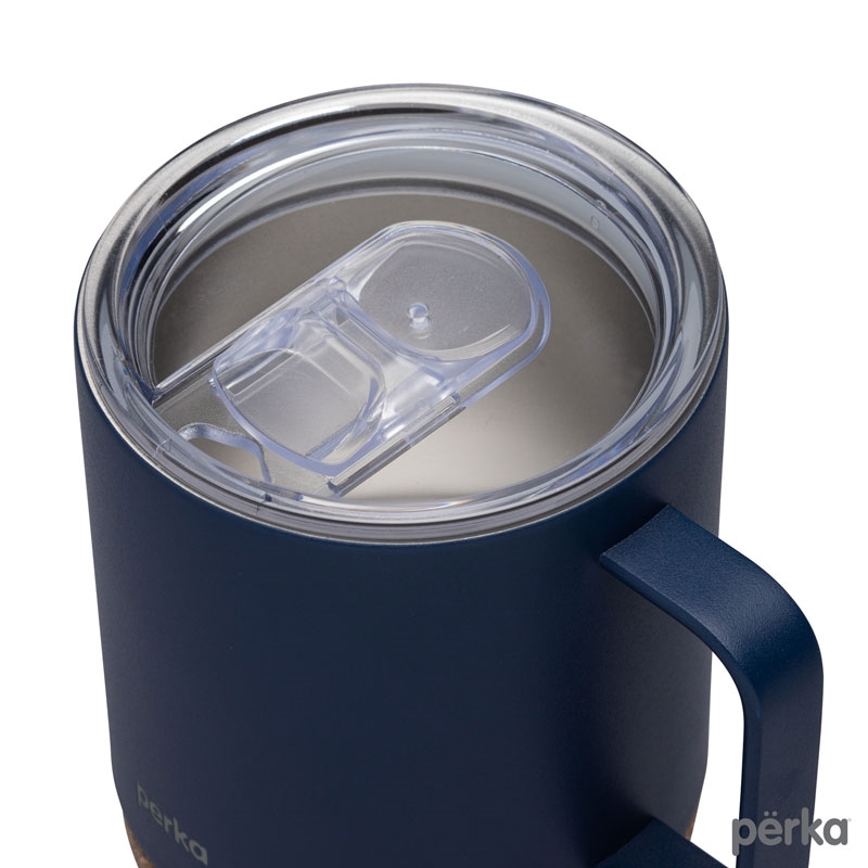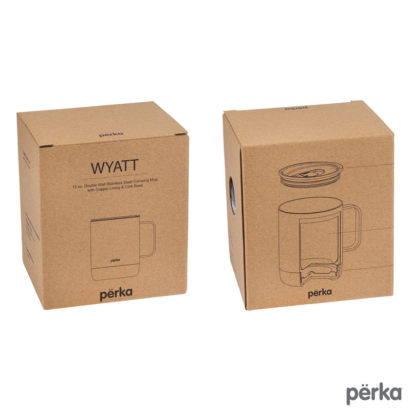 The Perka® 12 oz. Wyatt Mug is great for morning coffee whether in the backyard or camping. Its double wall 18/8 stainless steel vacuum-sealed construction and copper lining keep your favorite drink hot for 10 hours and cold for 18 hours. It has a molded cork base that protect desktops from scratches and provides an earthy look. The Wyatt’s clear push-in lid with sliding closure is easy to sip from and its handle is comfortable to hold. The powder coated finish is durable and sweat proof and the mug is FDA compliant and BPA Free. A portion of all proceeds is donated to Shelter to Soldier™, a non-profit organization that rescues dogs to train as service animals for veterans in need.