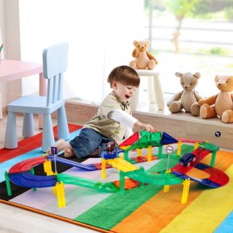 perfect educational present for school-age children that will never go out of style. LEARNING BY PLAYING - Never too early to start developing kids creativity. Children can acquire a strong sense of color, geometrical shapes including 3D forms, numbers, counts & architectural design at an early age. CREATIVITY BEYOND IMAGINATION - 3D Shape Building Blocks for preschool, pretend play and more. Easy to construct and easy to put away for storage. In the Box: 8 x Quarter Round Turn, 12 x Square Track Tiles, 16 x Supporting Columns, 4 x Rectangular Track Tiles, 4 x Tall Triangles, 4 x Slopes, 2 x LED Light Up Cars (AA Batteries required but not included).