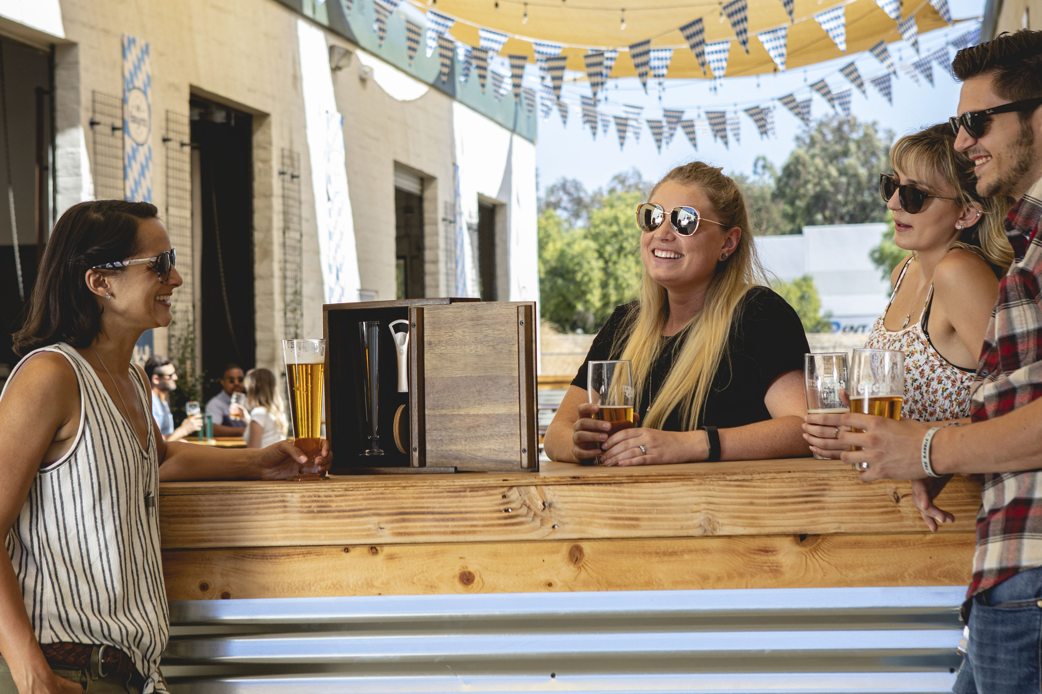 The handsome acacia wood and dovetail joinery of the Pilsner Craft Beer Set with 2 Beer Glasses can stand alone on your bartop as an objet d'art - but under the sliding, removable panel is the real treat for beer lovers: two tall 12 oz fluted beer glasses, two real cork beverage coasters, and a deluxe bottle opener. This beer glass set brings back the ceremony of serving drinks and is a worthy craft beer gift for the discerning beer lover in your life.