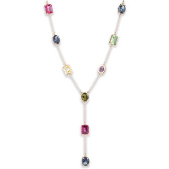 A look that will definitely not go unnoticed, this Lauren Ralph Lauren Y-necklace flaunts a mix of colorful stones in oval and rectangle shapes set in gold tone metal.
