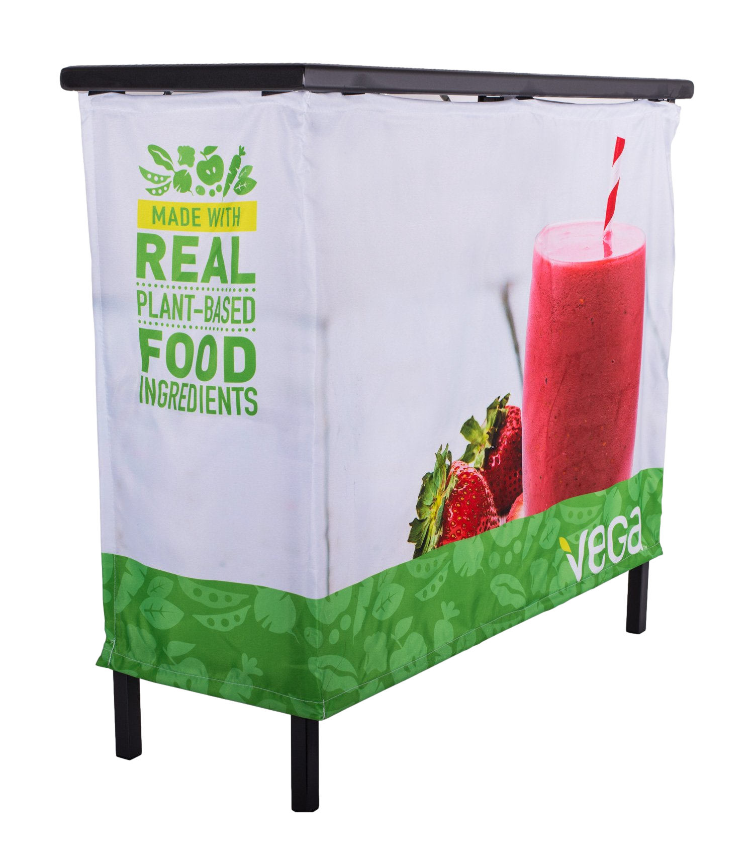 Create a visible presence that you can carry with you with this portable folding table! This table has a sturdy steel construction with a drop-down shelf. Easy, tool free assembly. The design folds flat for an easy setup and breakdown and includes a carry case with handles for easy transport. Create a customized look for the skirt with an all-over digitally printed image to create a branded effect at a grand opening, product launch, and marketing events