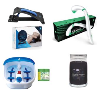 Package includes a Portable Neck & Shoulder Adjustable Massaging Wrap with an ultra-plush exterior made of micro mink fabric with two deep and powerful massaging modes and built-in heat; Portable Handheld Massager with ergonomic grip handle and 2 speed settings - requires 4 AA batteries (not included); Heated Foot Spa Massager with Tea Tree Oil Foot Scrub with changeable massage attachments; and a Yankee Candle Signature Large Jar Candle in Clean Cotton.