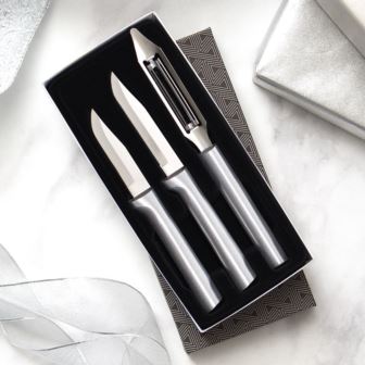 Set provides three basic knives needed every day in every kitchen by every cook-Peeling Paring, Serrated Regular Paring and Vegetable Peeler. With a combination of serrated and non-serrated blades, you'll never be without the right knife. And the Vegetable Peeler is perfect for all kinds of tasks, whether you're right- or left-handed. We hand sharpen surgical-grade T420 high-carbon stainless steel for a blade with maximum edge retention. Knives are hollow ground to achieve and maintain a sharp edge that lasts. Limited Lifetime Guarantee. Made in the USA.