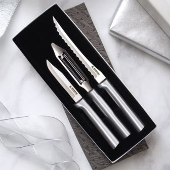 New and experienced cooks alike will love the perfect combination of tools that feature form, function, and impeccable good looks, all tucked inside an attractive gift box. 3-piece set includes a Regular Paring Knife, Vegetable Peeler, and Tomato Slicer. The blades are made of surgical-grade T420 high-carbon stainless steel for a blade that retains its edge and remains incredibly sharp. The Vegetable Peeler has a swiveling blade to accommodate both right- and left-hand users. Limited Lifetime Guarantee. Made in the USA.