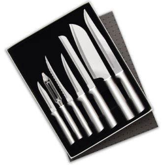 This set pares, peels, and slices through any food in the house. The 7-piece Starter Gift Set includes a Regular Paring Knife, Vegetable Peeler, Tomato Slicer, Super Parer, Bread Knife, Cook's Knife, and Slicer. We hand sharpen super-hard surgical-grade T420 high-carbon stainless steel for a blade with maximum edge retention. Knives are hollow ground to achieve and maintain a sharp edge that lasts. Limited Lifetime Guarantee. Made in the USA.