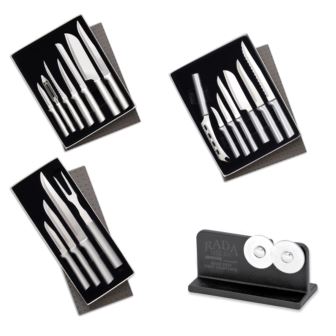 Starter Gift Set includes a Regular Paring Knife, Vegetable Peeler, Tomato Slicer, Super Parer, Bread Knife, Cook's Knife, and Slicer. Starter Set Part 2 7pc set includes a Cheese Knife, Granny Paring, Heavy Duty Paring, Utility/Steak Knife, Cook's Utility, Stubby Butcher, and Serrated Slicer. Prepare Then Carve 4 pc Gift Set comes with 3 knives-Regular Paring, Utility/Steak, and Slicer-and a Carving Fork. Also included is a knife sharpener. Limited Lifetime Guarantee. Made in the USA.
