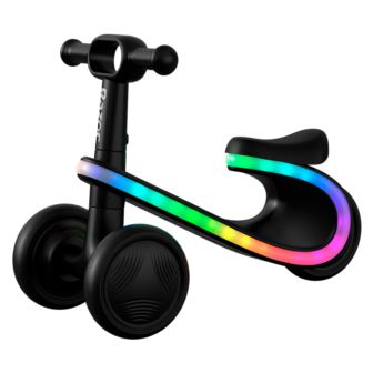 The Lightwave balance bike's three-wheel design and steering limit offer toddlers a stable, safe ride as they learn to move independently. Its vibrant frame features 42 multicolor LEDs that shut off after 5 minutes. A durable plastic frame, padded seat, and smooth 6-inch non-marking wheels ensure quiet indoor/outdoor play. With no pedals, it builds motor skills and coordination for ages 12–30 months, an ideal first step toward confidence and mobility.