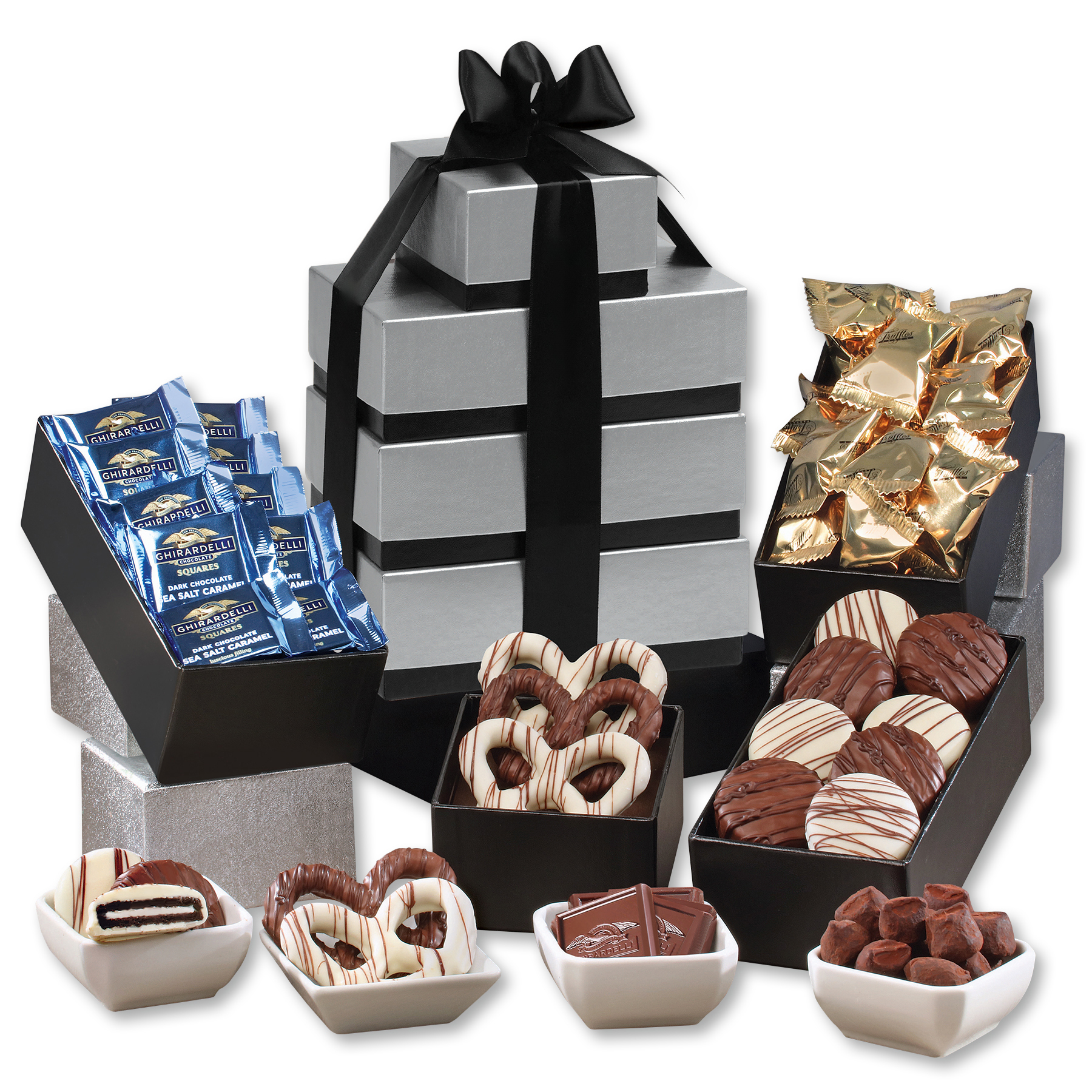 Each decadent chocolate in this generous tower is guaranteed to delight your recipients and comes individually wrapped for extra convenience. Great for sharingif they dont choose to keep it all for themselves! With so much variety there will be something sure to please everyone in the office. Contents: 3 Chocolate Dipped Pretzels, .8 oz. each 8 Chocolate Covered Oreo Cookies, 1 oz. each Ghirardelli Chocolate Squares, 5.32 oz. 18 Cocoa Dusted Truffles, 5.4 oz.