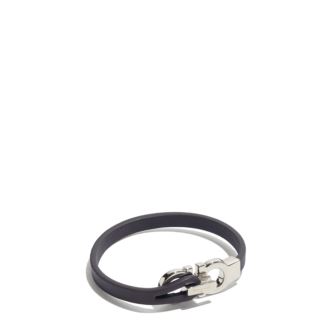 Essential style, minimal chic. Leather bracelet with a simple string and an iconic silhouette for the clasp: two matching Gancini are crossed by a leather knot, creating and asymmetrical, sophisticated flavor. Max length 7.48". Made In ITALY.