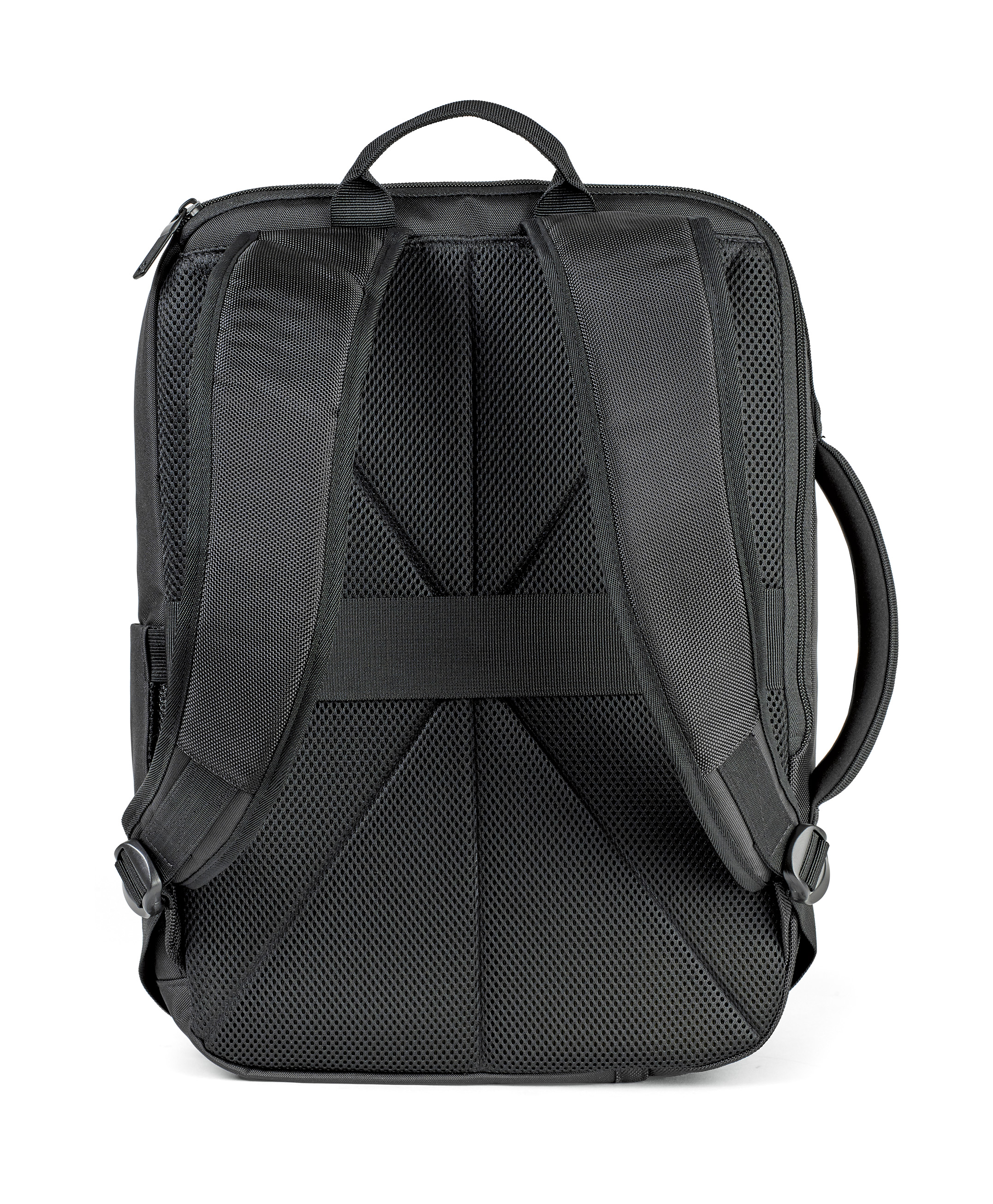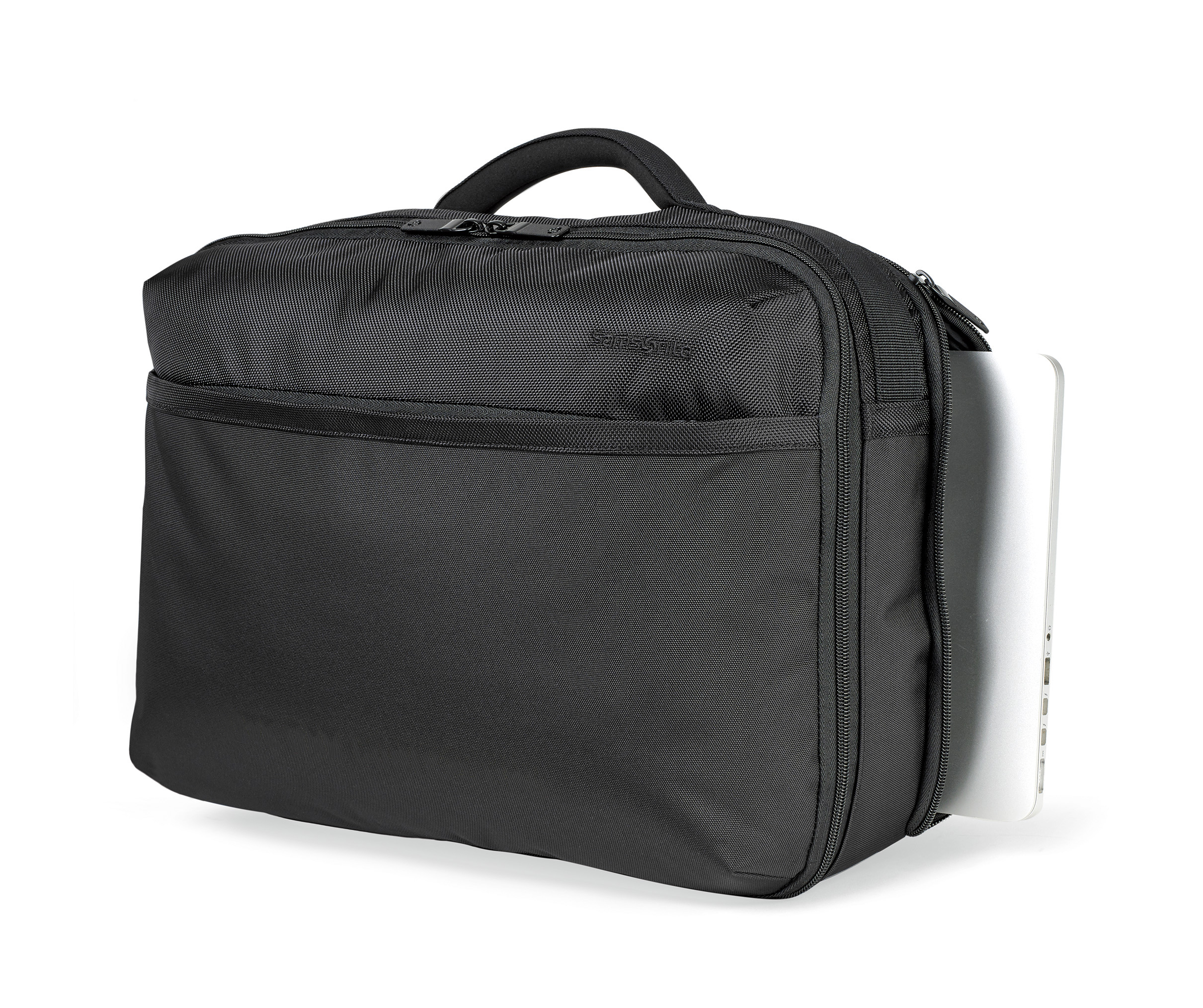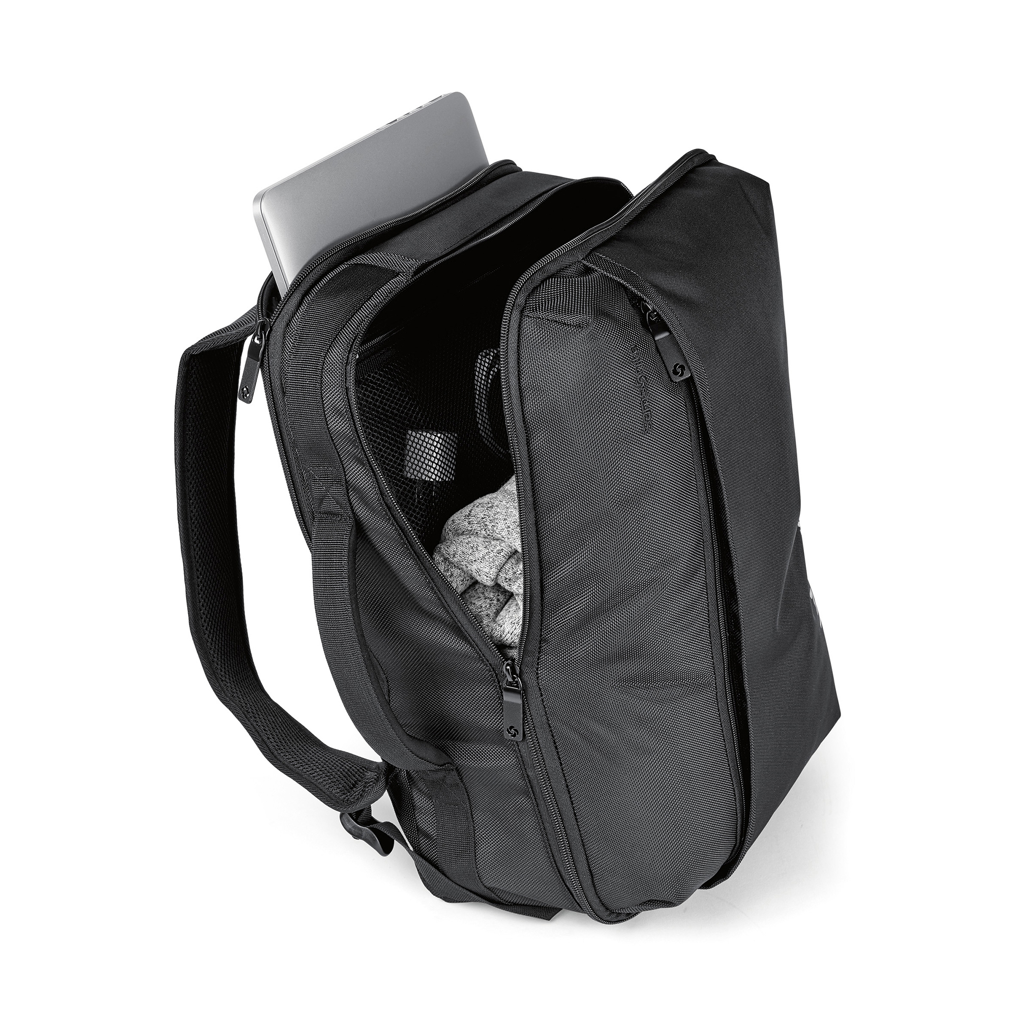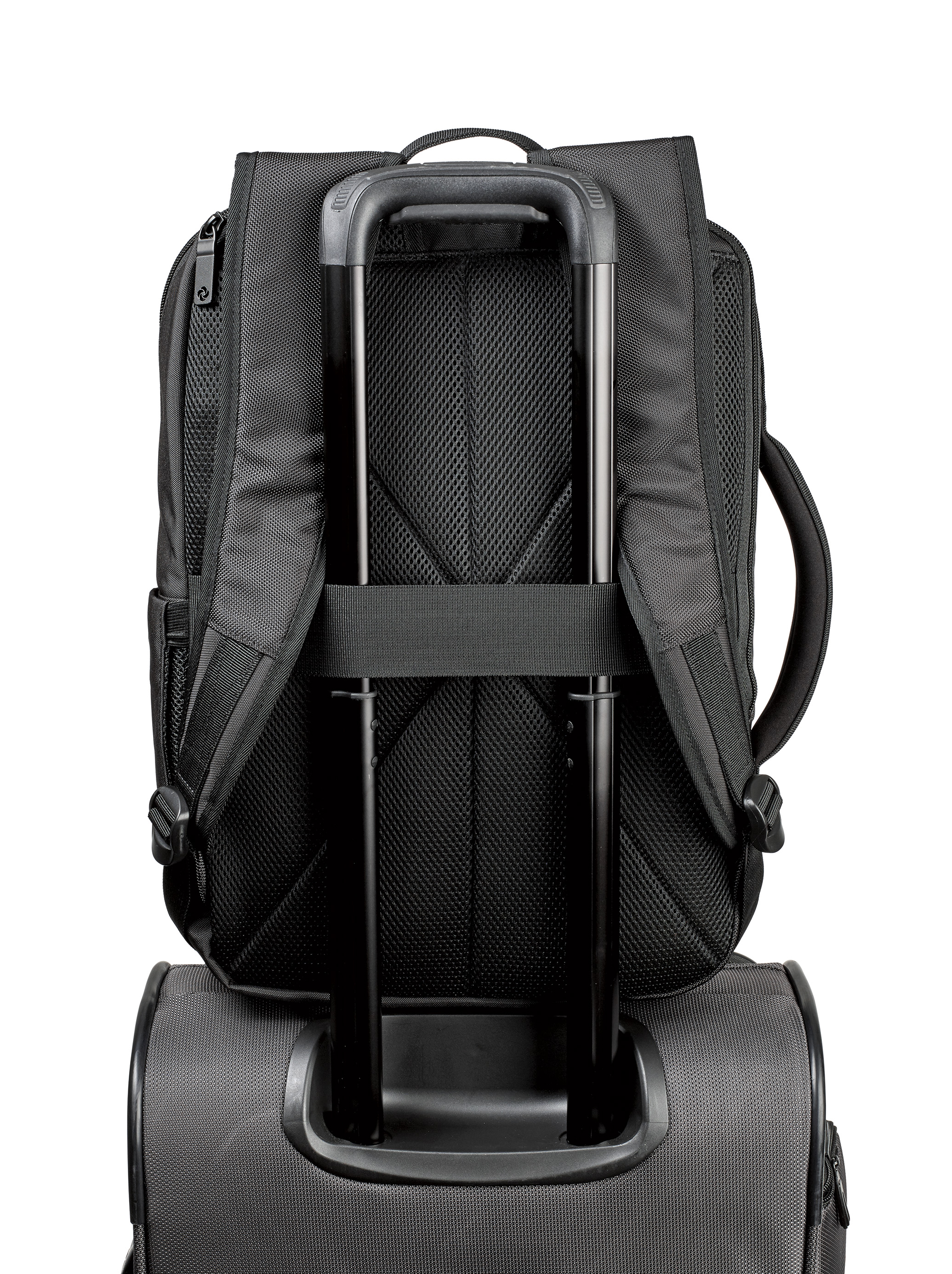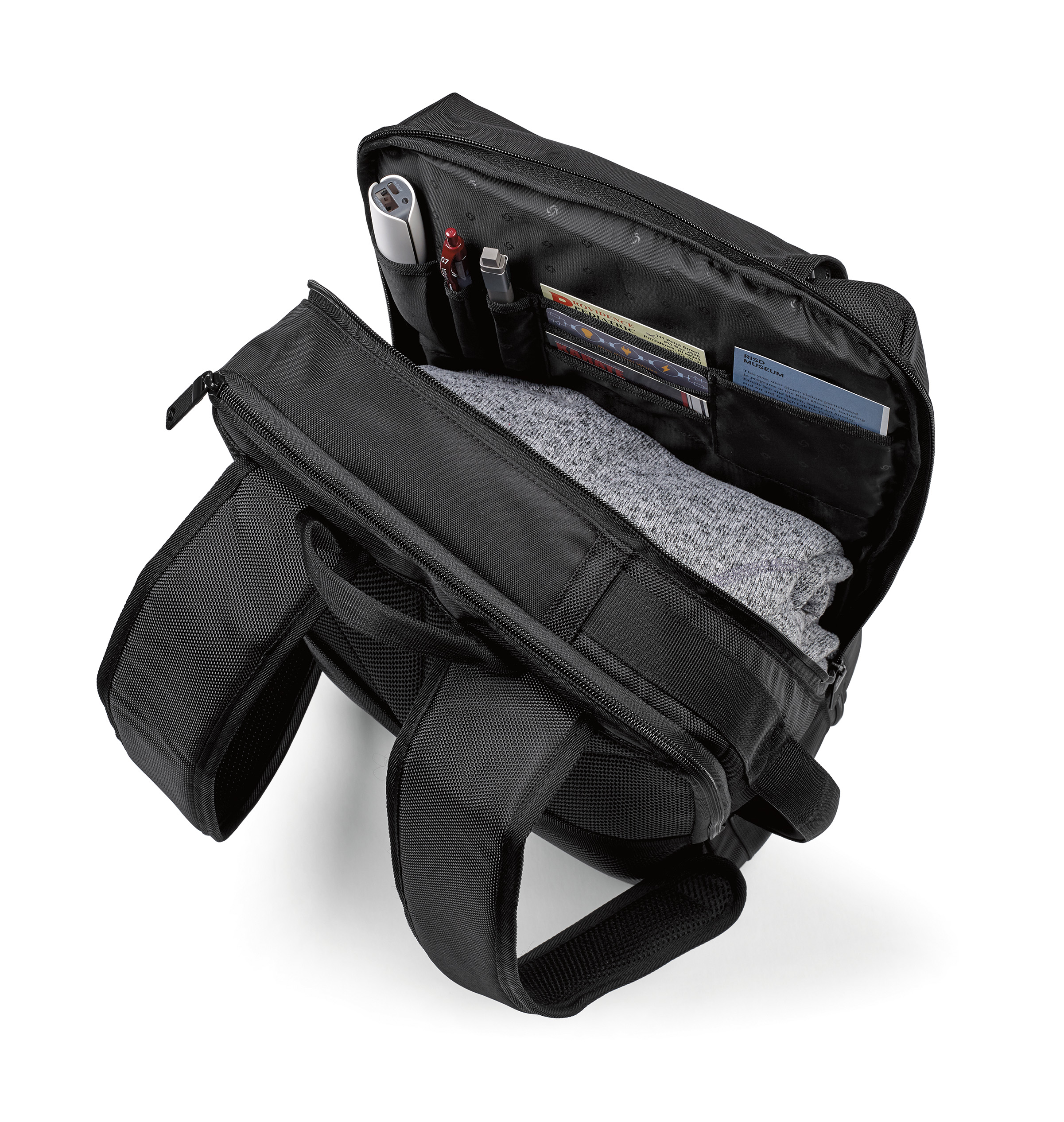 Dual carrying options. Padded side grab handle allows for carrying like a business bag. Shoulder straps allow for wearing as a backpack. Front zippered pocket. Side water bottle pocket. Main compartment with dual zippered opening. Zippered mesh pocket and multifunction organizer. Rear padded, zippered laptop compartment (fits up to a 17” laptop). SmartSleeve™ slides over upright handles for easy mobility. Top grab handle for easy carry. Fully padded, adjustable shoulder straps.