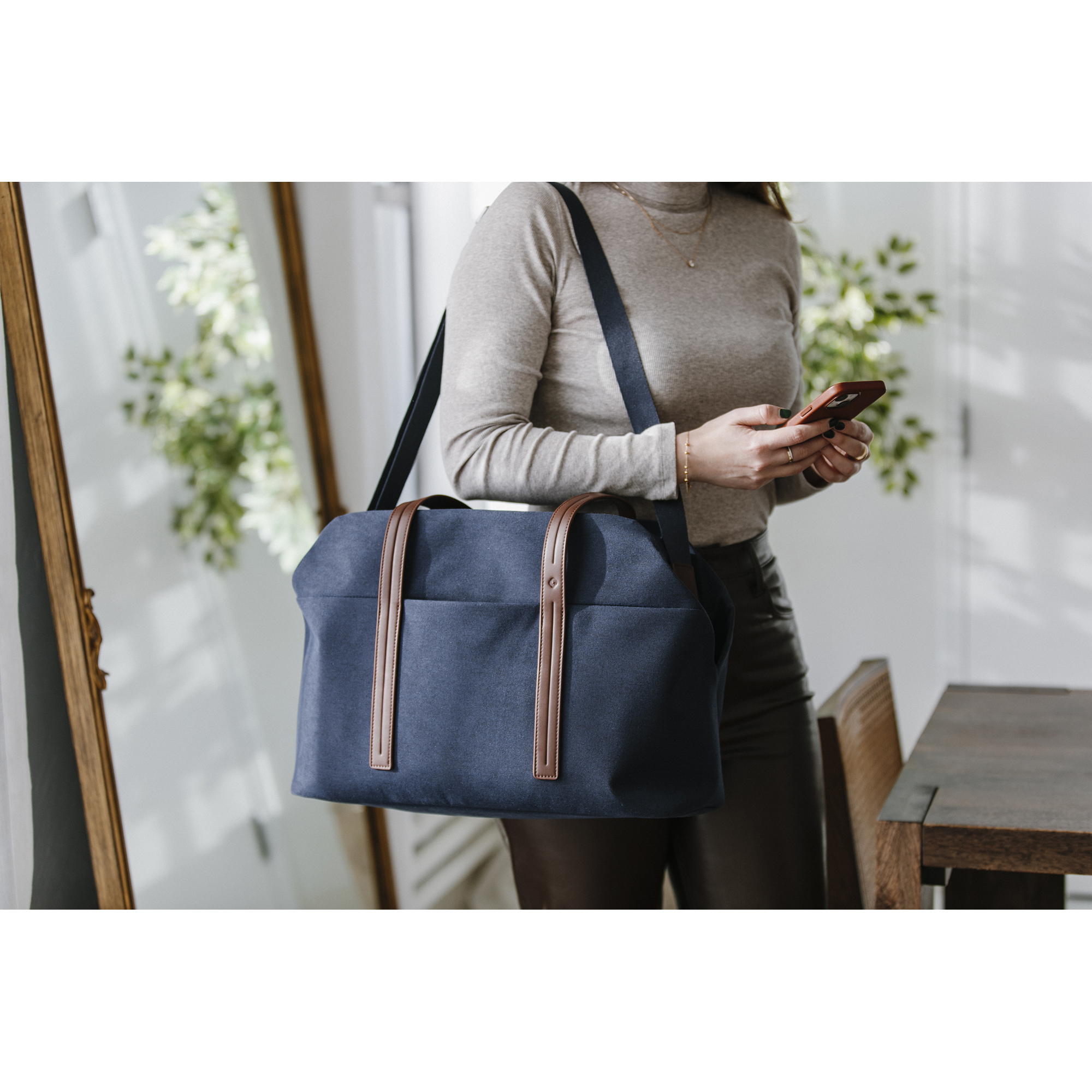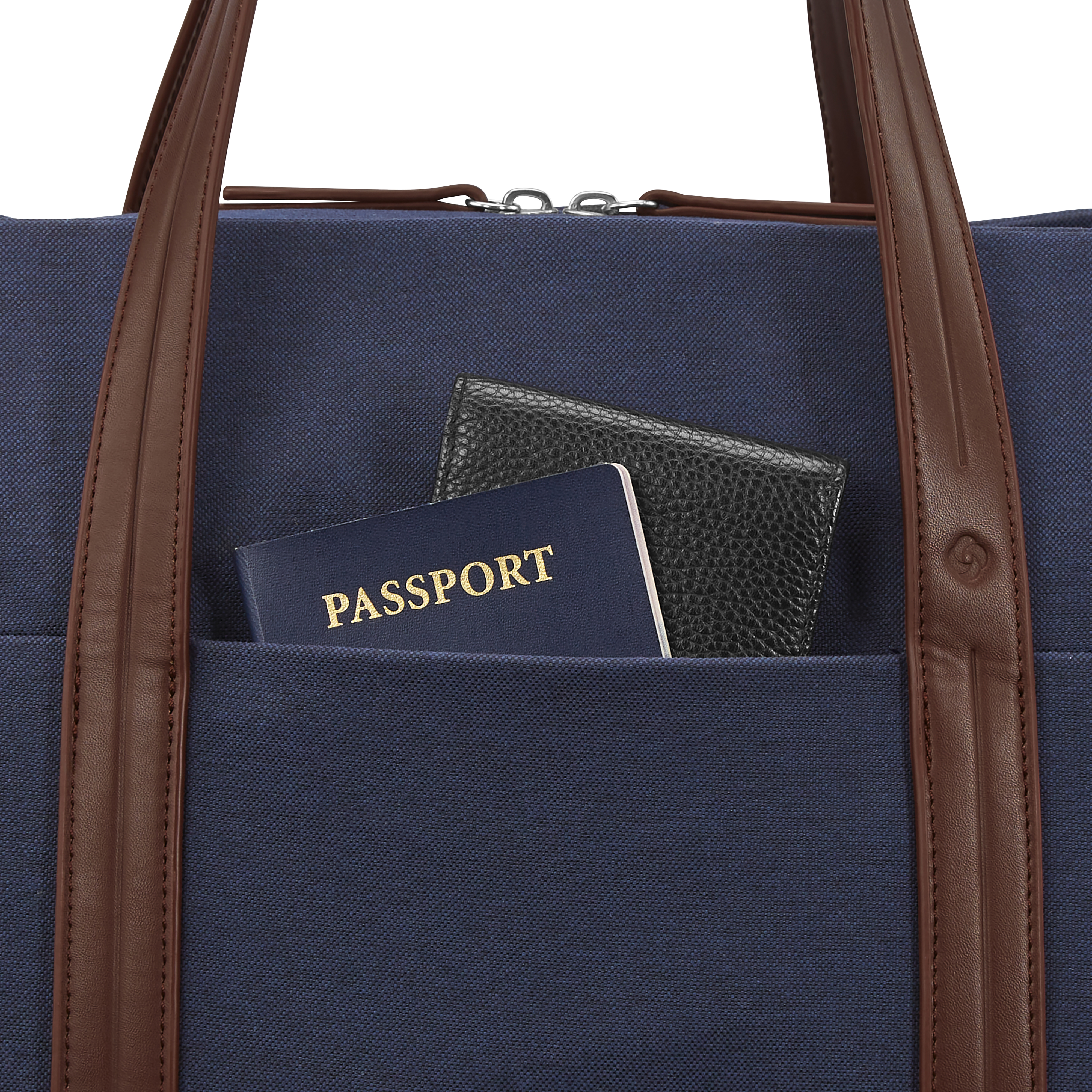 Sleek, versatile, ready to go. The Samsonite Virtuosa Weekender is crafted with recycled RPET materials and PU accents, offering modern style with smart function. It features a spacious main compartment, padded 15" laptop sleeve, and intuitive interior organization. Exterior zip and side pockets keep essentials close, while over-the-shoulder straps, removable shoulder strap, and SmartSleeve™ make travel effortless.