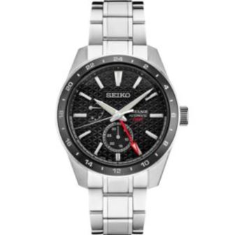 Presage Sharp-Edged Series GMT. Offering the finest in Japanese mechanical watchmaking, the Presage Collection blends precision technology with superior craftsmanship and design. Known for unique dials reflecting centuries of artistry, Presage embraces the fresh look of contemporary Japanese design with this coolly angular timepiece. The theme of energy is captured by the intricate dial pattern, based on the traditional Asanoha hemp leaf motif of the Heian Period (794-1185 AD), a symbol of growth and prosperity.