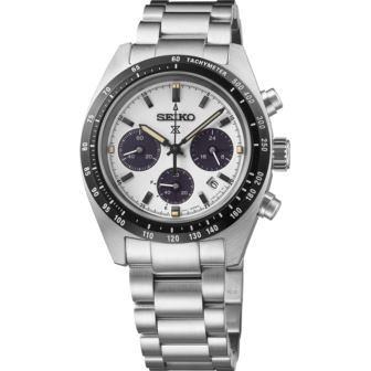Seiko Speedtimer Solar Chronograph. Designed for those who treat life as the ultimate adventure, Seiko Prospex keeps moving forward, meeting every challenge with technological excellence and winning design. This dramatic watch is part of a high-intensity collection inspired by the 1969 Speedtimer, the world's first self-winding chronograph, and employs an iconic black and white color scheme nicknamed ''Panda'' by fans. Framed by a black tachymeter bezel, the white dial features high-contrast subdials, 24-hour and power reserve indicators, a date calendar, and LumiBrite on the hands, markers, and the tip of the chronograph hand for superior visibility. The chronograph function measures up to 60 minutes of elapsed time in 1/5-second increments and includes a split time function, while the solar cell, powered by any light source, with no battery change required, provides a 6-month power reserve when fully charged. Crafted of stainless steel, this timepiece includes a curved anti-reflective sapphire crystal, secure screwdown caseback and tapered three-link bracelet with tri-fold push button release clasp. 10 bar, 100M Water Resistant