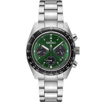 Prospex Speedtimer Solar Chronograph. Designed for those who treat life as the ultimate adventure, Seiko Prospex keeps moving forward, meeting every challenge with technological excellence and winning design. This dramatic watch is part of a high-intensity collection inspired by the 1969 “Speedtimer," the world's first self-winding chronograph. The chronograph function measures up to 60 minutes of elapsed time in 1/5-second increments and includes a split time function, while the solar cell, powered by any light source, with no battery change required, provides a 6-month power reserve when fully charged. Framed by a black tachymeter bezel, the green sunray dial features 24-hour and power reserve indicators, as well as a date calendar and LumiBrite on the hands, markers and the tip of the chronograph hand. Crafted of stainless steel, this timepiece includes a curved anti-reflective sapphire crystal, secure screwdown caseback and tapered three-link bracelet with tri-fold push button release clasp. 10 bar, 100M Water Resistant