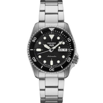 Seiko 5 Sports SKX Mid-Size. With vintage styling and colors recalling the quartz diver's watches of the 1980s, the mid-size SKX design offers the 38mm case diameter of the originals, but with a slimmer case and a durable, yet comfortable, three-row sport bracelet. Providing automatic technology that you control with every movement, this dynamic timepiece is powered by a 24-jewel movement that beats at a frequency of 21,600 vibrations per hour, with a power reserve of approximately 41 hours and manual winding capability. The rich black dial, framed by a black uni-directional rotating elapsed timing bezel, features a day/date calendar and luminous hands and markers. In stainless steel, with locking tri-fold push button release clasp and a screwdown see-through caseback for a view of classic timekeeping in action. 10 bar, 100M Water Resistant.