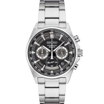 Chronograph measures up to 60 minutes of elapsed time in 1/5-second increments, Black tachymeter ring, Dimensional embossed black dial with applied metallic elements and gray accents, 24-hour subdial, Date calendar, LumiBrite hands and markers, Case diameter: 41.0mm, Stainless steel case and bracelet, Water-resistant to 10 bar, 100 meters (330 feet),