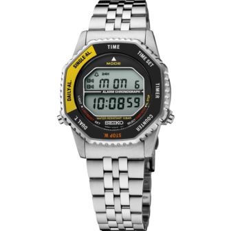 From the Essentials Collection. Inspired by one of Seiko's iconic early digital models that was nicknamed “Rotocall" by fans, this exceptional watch incorporates iconic elements of the vintage creations while providing upgraded performance for today. With a design that gained notoriety for being worn by astronauts in the 1980s, it is equipped with a compact case and bracelet construction and a unique yellow and black octagonal bezel that can be rotated to easily change modes on the LCD display, which employs the same font type that was used in the original styles. The charmingly retro timepiece also offers a 1/100 second chronograph and day/date displays as well as alarm, battery life warning, and dual time functions. Crafted of stainless steel, this versatile timepiece includes a tri-fold push button release clasp and is water resistant to 100 meters.