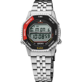 From the Essentials Collection. Inspired by one of Seiko's iconic early digital models that was nicknamed “Rotocall" by fans, this exceptional watch incorporates iconic elements of the vintage creations while providing upgraded performance for today. With a design that gained notoriety for being worn by astronauts in the 1980s, it is equipped with a compact case and bracelet construction and a unique red and black octagonal bezel that can be rotated to easily change modes on the LCD display, which employs the same font type that was used in the original styles. The charmingly retro timepiece also offers a 1/100 second chronograph and day/date displays as well as alarm, battery life warning, and dual time functions. Crafted of stainless steel, this versatile timepiece includes a tri-fold push button release clasp and is water resistant to 100 meters.