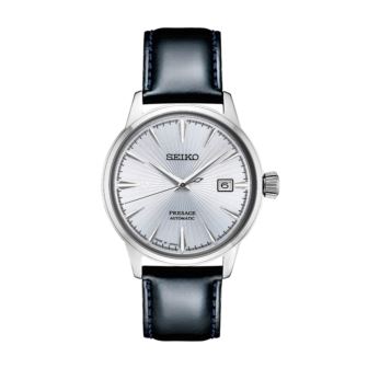 Seiko Presage Automatic. This refine men's watch is designed with a stainless steel case and black leather strap. The dial features a light deep, pressed pattern whose shimmering beauty is enhanced by seven layers of gloss finish and the clarity of the box-shaped crystals. The hands are delicately curved by skilled craftsmen and women to give the watch case a slimmer profile. When turning the uniquely shaped crown, you can feel the strong torque of the winding mechanism. Automatic movement allows self and automatic winding capabilities and features 21,600 vibrations per hour, with a power reserve of approximately 41 hours, as well as 23 jewels. 50M Water Resistant.