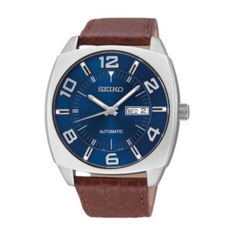 Seiko RECRAFT Series. This casual self-winding automatic timepiece is designed with a square stainless steel case and brown leather band. The blue dial features day/date calendar, luminous hands and markers, and a screwdown see-through case back. 21 jewels. 50 meters water resistant.
