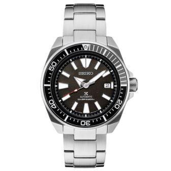 Seiko Prospex Automatic Diver. This diver's watch is designed with a stainless steel case and bracelet featuring a black rotating bezel. The black dial displays a date calendar with lumibrite hands and markers. Automatic movement allows self and automatic winding capabilities and features 21,600 vibrations per hour, with a power reserve of approximately 41 hours, as well as 23 jewels. 200M Water Resistant
