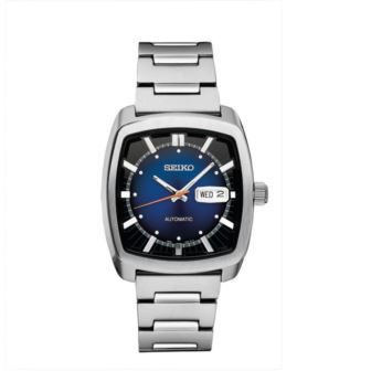 Seiko RECRAFT Series Automatic. This sophisticated men's watch is designed with a rectangular stainless steel case and bracelet, featuring a blue dial and day/date calendar with see-through caseback. Automatic movement allows self and automatic winding capabilities and features 21,600 vibrations per hour, with a power reserve of approximately 41 hours, as well as 21 jewels. 50M Water Resistant