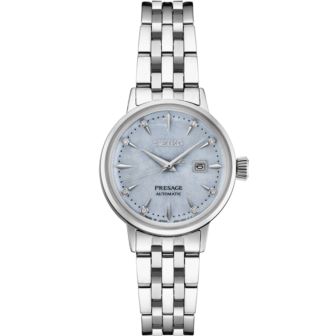 Seiko Presage Cocktail Time. Offering the finest in Japanese mechanical watchmaking, the Presage Collection blends precision technology with superior craftsmanship and design. Inspired by the vibrance of the city's modern's lounges, the newest Cocktail Time designs express the excitement of today's Tokyo, with fresh styling and colors. With 8 diamonds adding sparkle to a pale blue dial with pressed pattern and gloss finish, this exquisite timepiece evokes the Skydiving cocktail. Sleek and elegant, the gracefully slender case houses the new, thinner caliber 21-jewel automatic mechanical 2R05 movement, which beats at a frequency of 21,600 vibrations per hour, with a power reserve of approximately 41 hours and manual winding capability. The beautifully tapered five-row bracelet features a mirror finish for additional brilliance. Crafted of stainless steel, with date calendar, box-shaped crystal, screwdown caseback, and deployment clasp with push button release. 5 bar, 50M Water Resistant