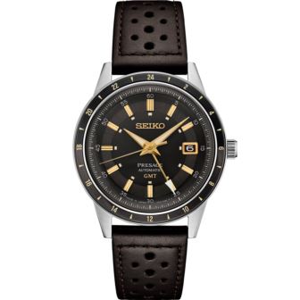 Presage Style '60s GMT. Offering the finest in Japanese mechanical watchmaking, the Presage Collection blends precision technology with superior craftsmanship and design. Inspired by the steering wheel, levers, instruments and metallic colors of vintage 1960s touring cars, the new Style '60s GMT models create a distinctive retro feel with broad angular lines, box-shaped crystals, faceted indices and sharp hand design. Celebrating the spirit of the decade, the collection incorporates dial elements from Seiko's 1964 “Crown Chronograph," Japan's first watch with a stopwatch function. Framed by a black and dark gray 24-hour GMT bezel, the dark brown-gray dial features gold accents, a date calendar, a GMT hand, and LumiBrite hands and markers. The screwdown see-through caseback provides a view of the 24-jewel movement with manual winding capability, a frequency of 21,600 vibrations per hour and a power reserve of approximately 41 hours. Crafted of stainless steel, in a new hairline finish suggesting the metallic, machine-like feel of '60s cars, this memorable timepiece includes a brown perforated leather strap echoing classic interior elements. 10 bar, 100M Water Resistant