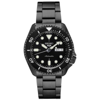 Show your style. Make your move. To a real watch, from a company that knows what real watchmaking is: the Seiko 5 Sports Collection. For reliable timing in your everyday life, this timepiece is powered by an automatic movement with a power reserve of approximately 41 hours and features a day/date calendar, LumiBrite hands and markers, and a see-through caseback. With a black ion finished stainless steel case and bracelet and a black dial framed by a black rotating bezel, this versatile watch is 100 meter water resistant- perfect for your style no matter what your day has in store.