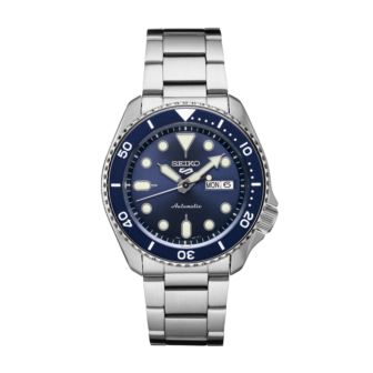 Show your style. Make your move. To a real watch, from a company that knows what real watchmaking is: the Seiko 5 Sports Collection. For reliable timing in your everyday life, this timepiece is powered by an automatic movement with a power reserve of approximately 41 hours and features a day/date calendar, LumiBrite hands and markers, and a see-through caseback. With a durable stainless steel case and bracelet and a blue sunray dial framed by a blue rotating bezel, this versatile watch is 100 meter water resistant- perfect for your style no matter what your day has in store.