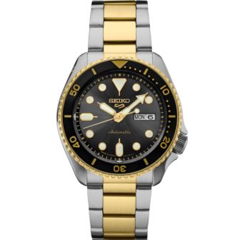 Seiko 5 Sports U.S. Special Creation. Adding new richness to classic sport/dress design, this stylish watch, available exclusively in the U.S., delivers all-day versatility with a cutting edge. Providing automatic technology that you control with every movement, this dynamic timepiece is powered by a 24-jewel movement that beats at a frequency of 21,600 vibrations per hour, with a power reserve of approximately 41 hours and manual winding capability. Framed by a black uni-directional rotating elapsed timing bezel, the sunray-finish charcoal gray dial features luminous hands and markers, and a date/day calendar. Crafted of stainless steel in two-tone finish, this exceptional watch includes a tri-fold push button release clasp with lock, as well as a screwdown see-through caseback for a view of classic timekeeping in action. 10 bar, 100M Water Resistant